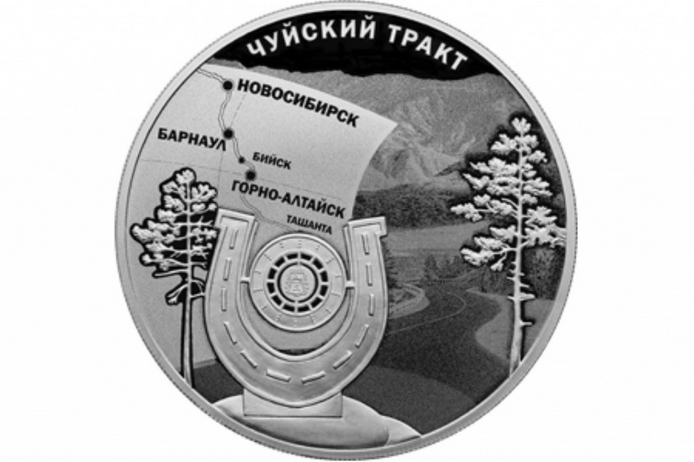 Трёхрублёвую памятную монету из серебра выпустил Банк России к 100-летию Чуйского тракта. На аверсе изображена карта с трассой, которая начинается от Новосибирска. Монеты вышли ограниченным тиражом.