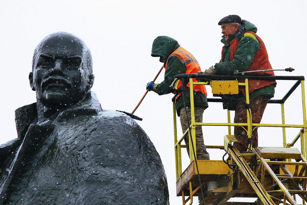 Бронзовое изваяние на главной площади города помыли, как и всегда, накануне дня рождения Ильича. На гигиенические процедуры потратили больше 3000 литров воды с шампунем.