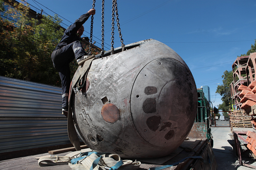 Модуль космического корабля «приземлился» в строящемся доме Кондратюка. Спусковой аппарат «Восток» 1961 года передали из Сибирского научно-исследовательского института авиации имени Чаплыгина.