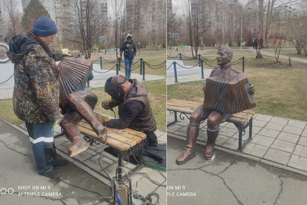 Колоритная фигура Василия Тёркина приехала в сквер на Родниках после реставрации. Литературного персонажа с гармонью разместили на той же самой лавочке, где он сидел раньше.