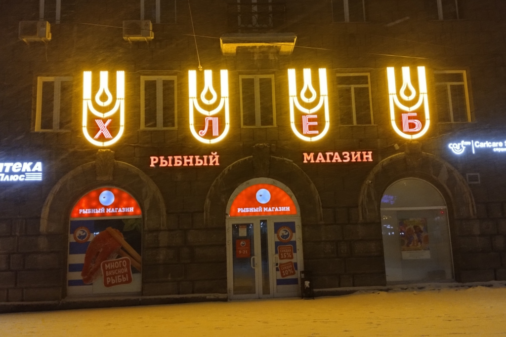 На фасад жилого дома по адресу Вокзальная магистраль, 2 вернули восстановленную вывеску «Хлеб». Надпись изготовили заново, а стеклянные трубки заменили гибким неоном. Теперь рядом с площадью у вокзала ночами будет гораздо светлее. Четыре буквы, обрамлённые конструкциями в форме колоса, сияют тёплыми оттенками.