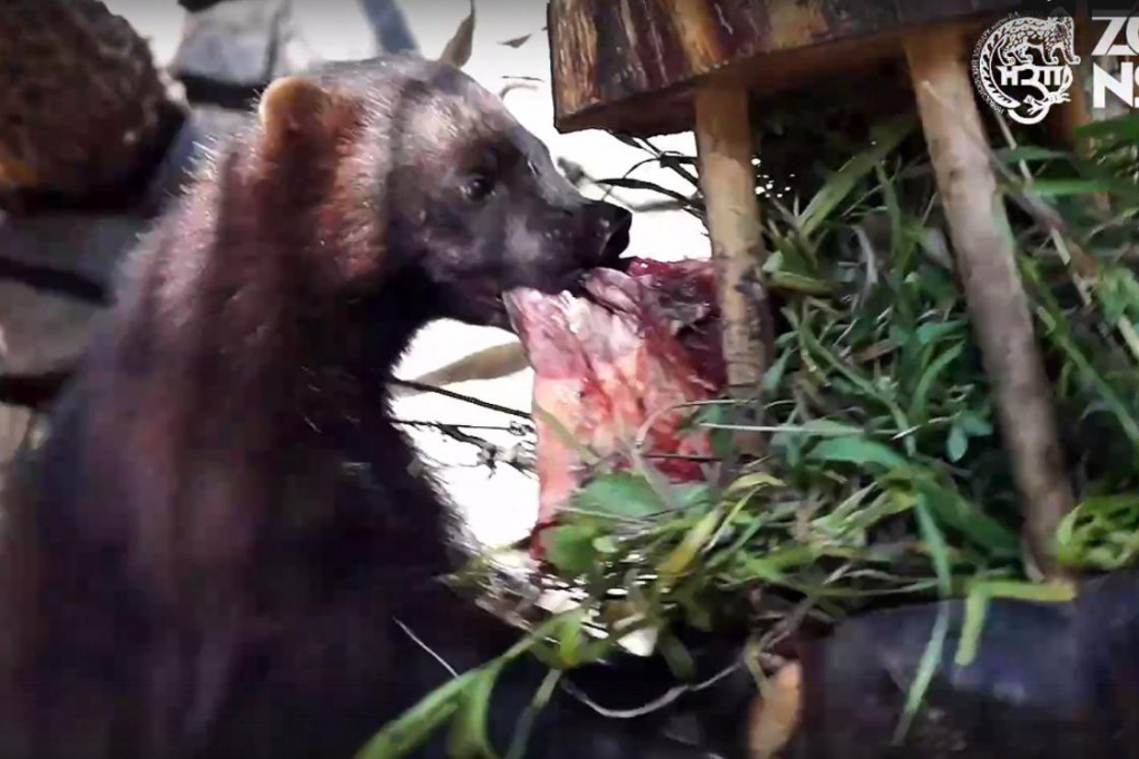 Росомаха добыла обед из кормушки с травой в Новосибирском зоопарке