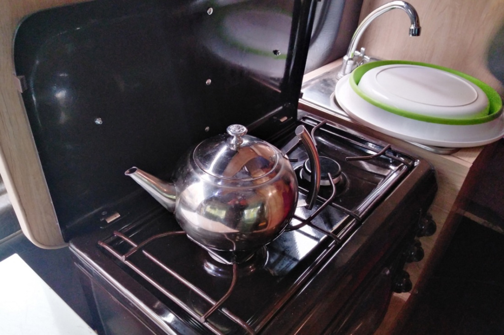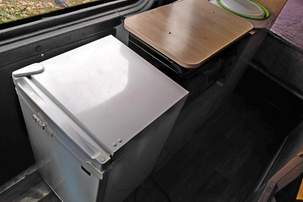 Поскольку Евгений занимается туризмом, одним из основных требований к машине было, чтобы в её салон помещался разобранный парусный катамаран. Кроме него, внутрь входят спальное место на двоих, холодильник, стол, газовая плитка с баллоном, мойка с краном и 100-литровый бак с водой. Есть ещё место под душевую кабину с поддоном и в комплекте биотуалет. Но хозяева этот закуток решили использовать для перевозки необходимых вещей.