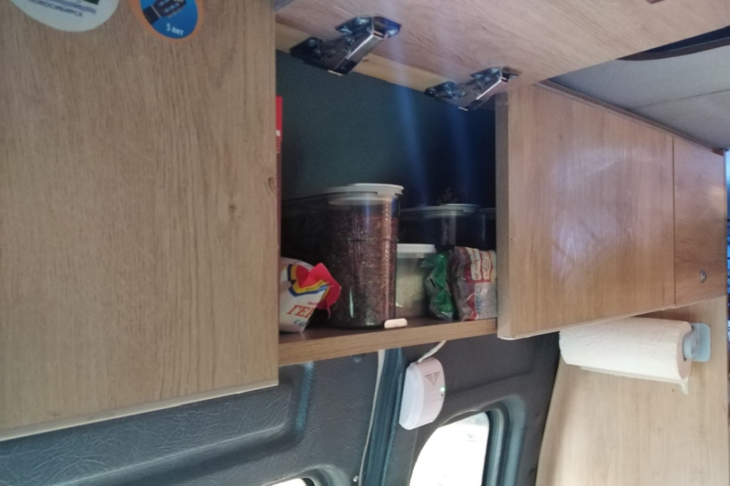 Внешне на автодом она не похожа. Выглядит как обыкновенная маршрутка с тонированными окнами. На крыше установлена солнечная батарея, чтобы заряжать аккумулятор, от которого работают освещение и холодильник. В салоне по верху идут полки для хранения всего необходимого. Все дверцы плотно закрываются.
