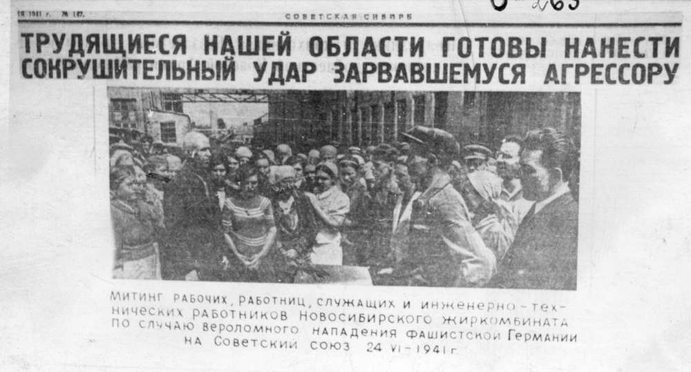 «Не будем жалеть сил для победы», «В этой войне будет участвовать весь народ», «Железной дисциплиной способствовать победе», «Все пойдём!» — это и цитаты из выступлений на митингах, и заголовки газеты «Советская Сибирь» за июнь 1941 года. Тысячи новосибирцев — и мужчин, и женщин — идут в военкоматы.