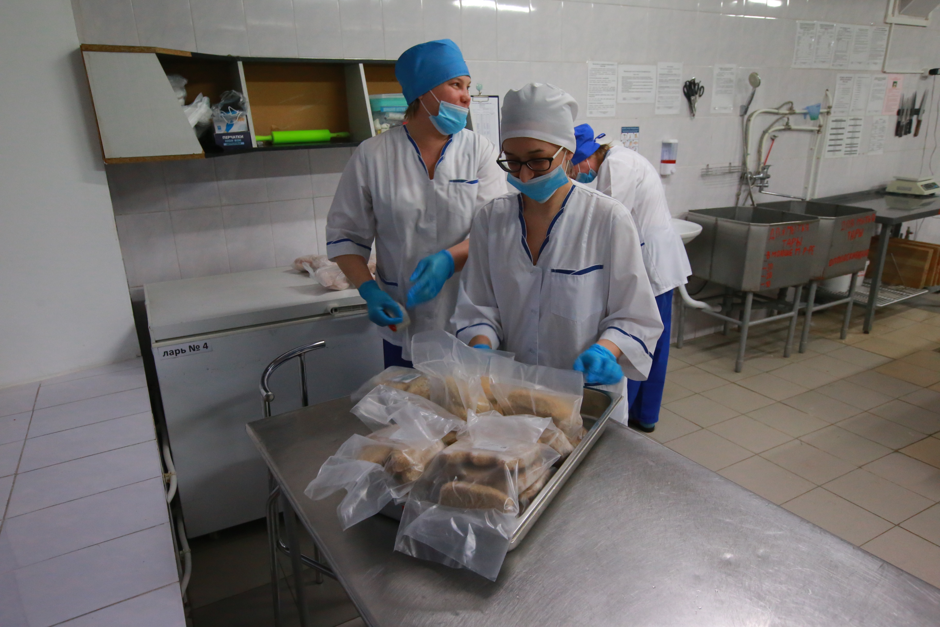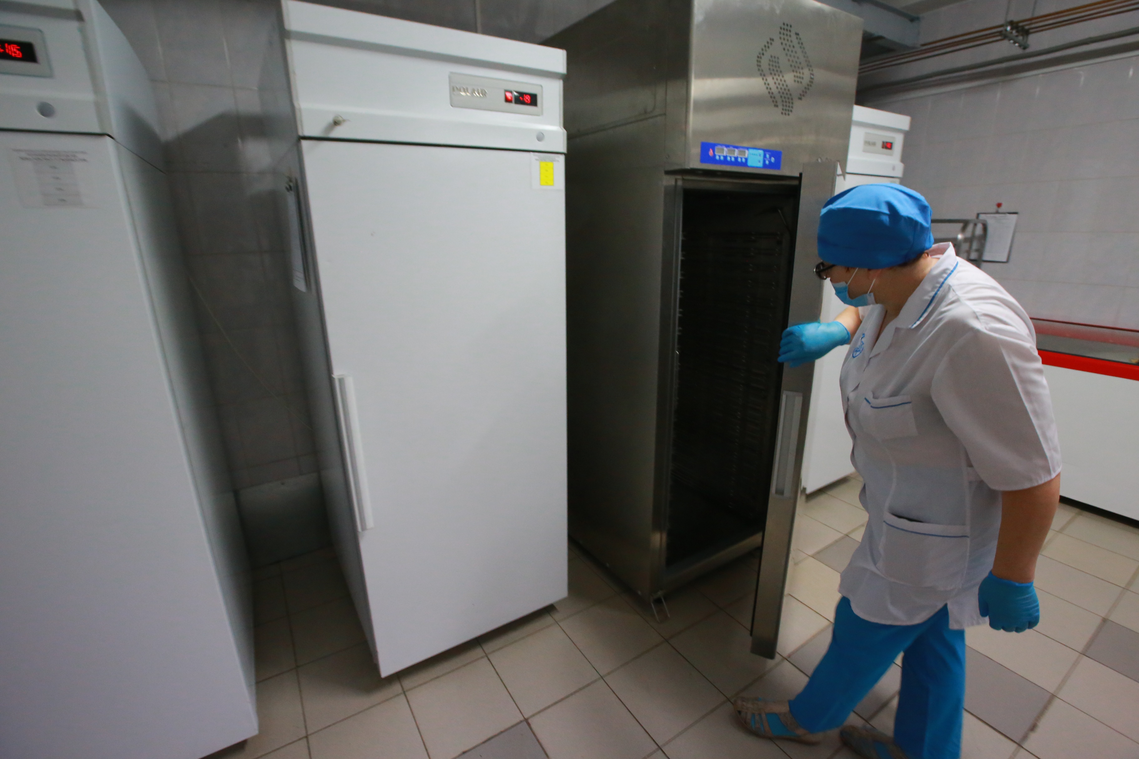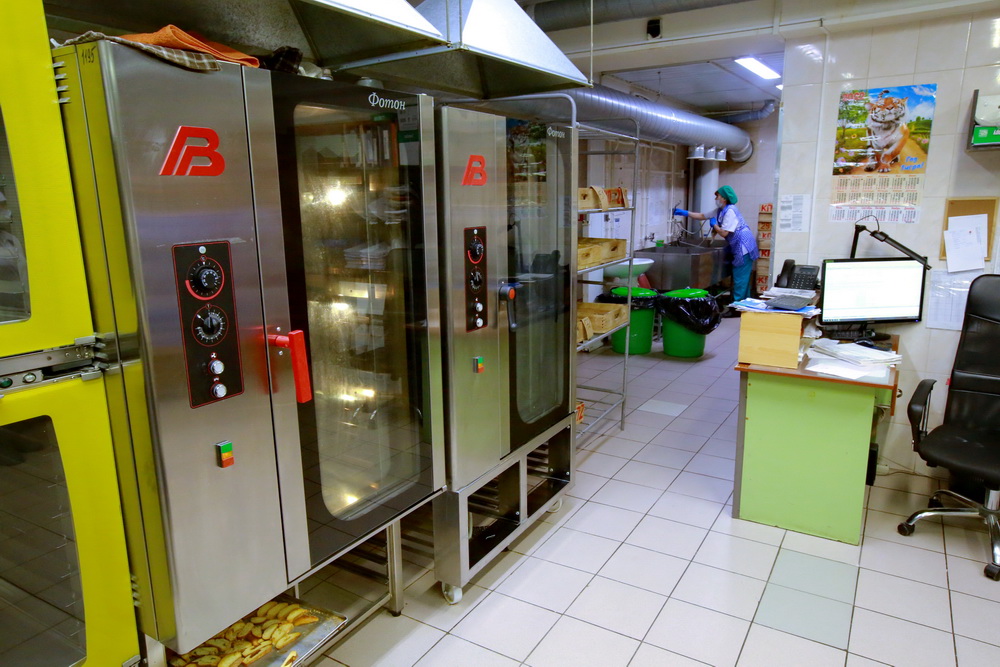 Кроме завтраков, комплексных обедов и выпечки, повара комбината готовят и полуфабрикаты с применением шоковой заморозки. Для этого в цеху стоит морозильный шкаф, где температура достигает −70 градусов.