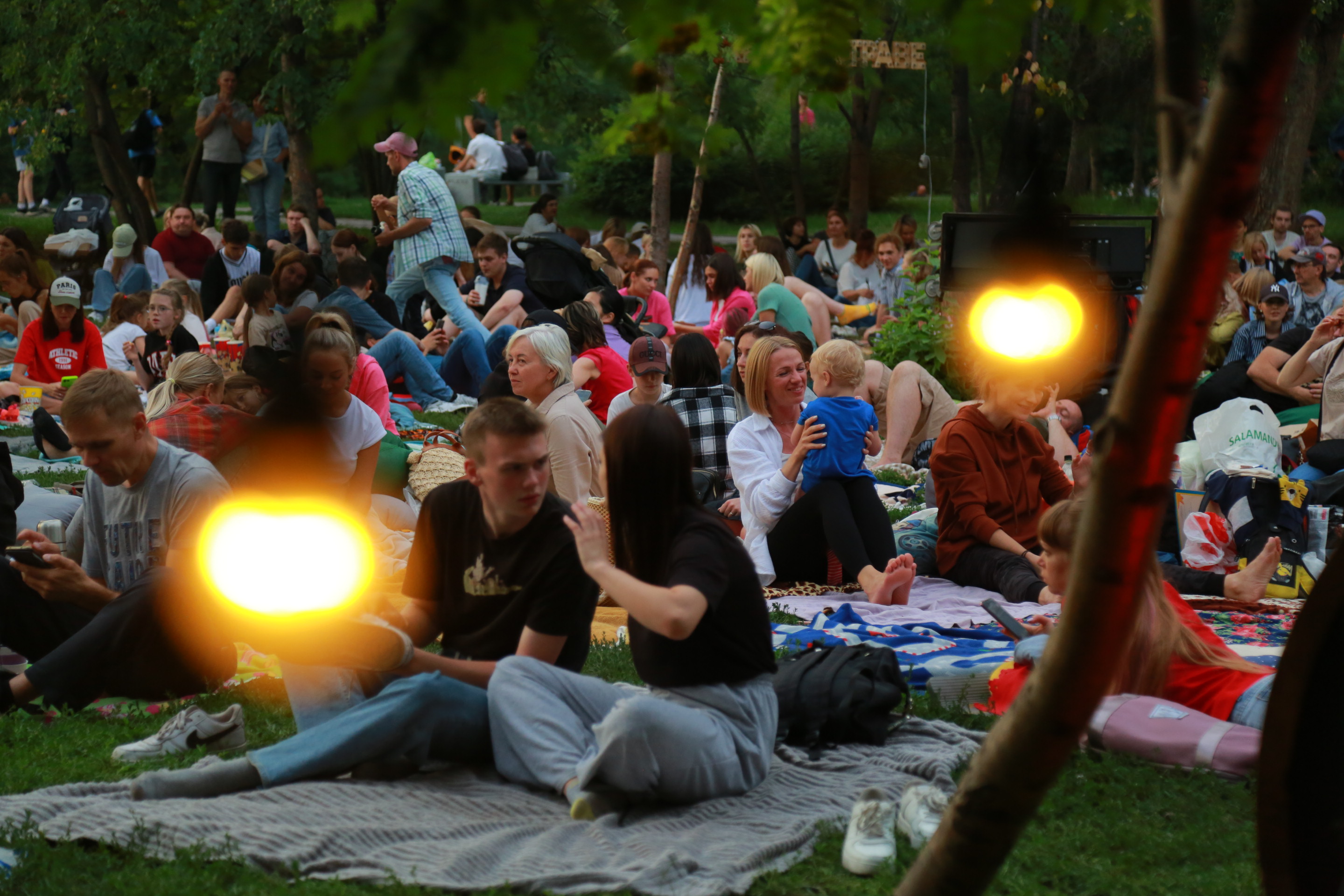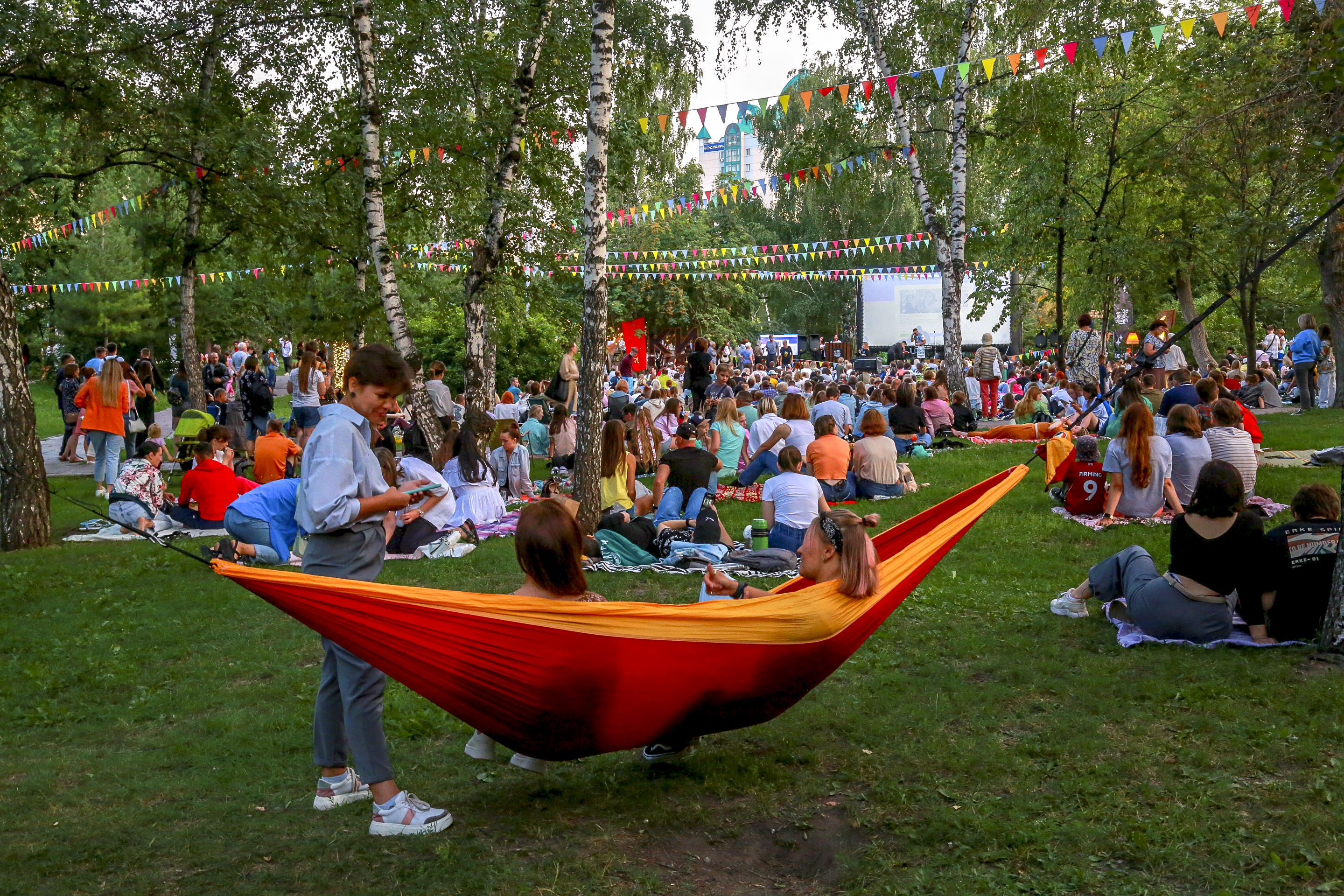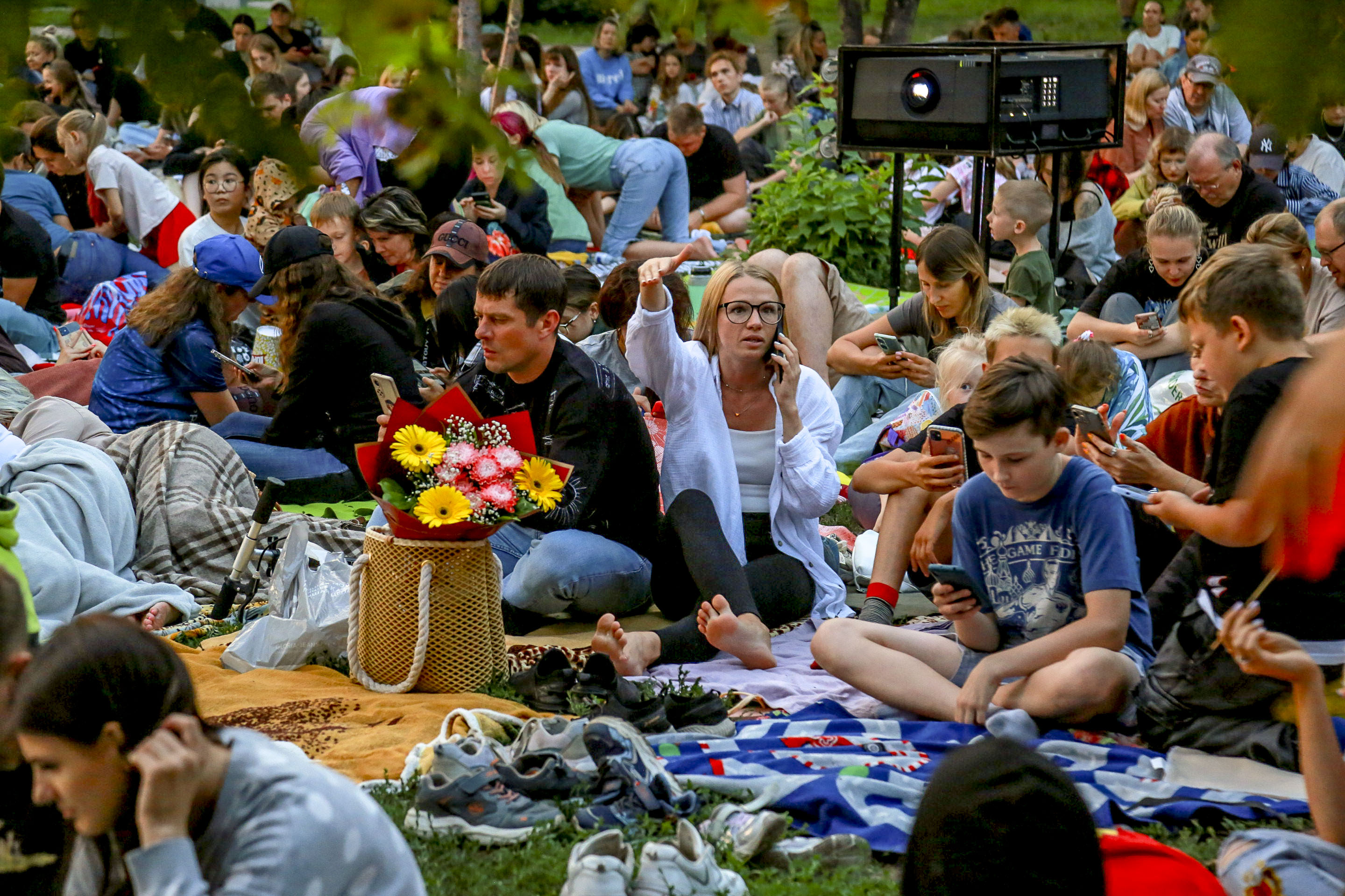 Летний фестиваль «Кино на траве», проходящий в Нарымском сквере, собирает всё больше поклонников. Как правило, зрители заранее онлайн выбирают фильм, который вместе посмотрят в пятницу вечером под открытым небом. Но в этот раз организаторы предлагают провести тайный показ. Если вы ещё не видели кино на траве — вдохновляйтесь нашими фотографиями и готовьте плед для следующего сеанса.