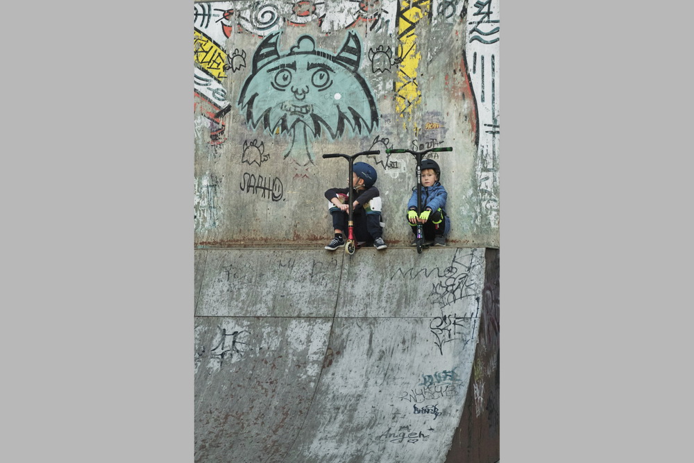 На снимке Ольги Бурмистровой, сделанном в Краснодаре, запечатлены сын фотографа со своим другом, сидящие на вершине горки бетонного скейт-парка.