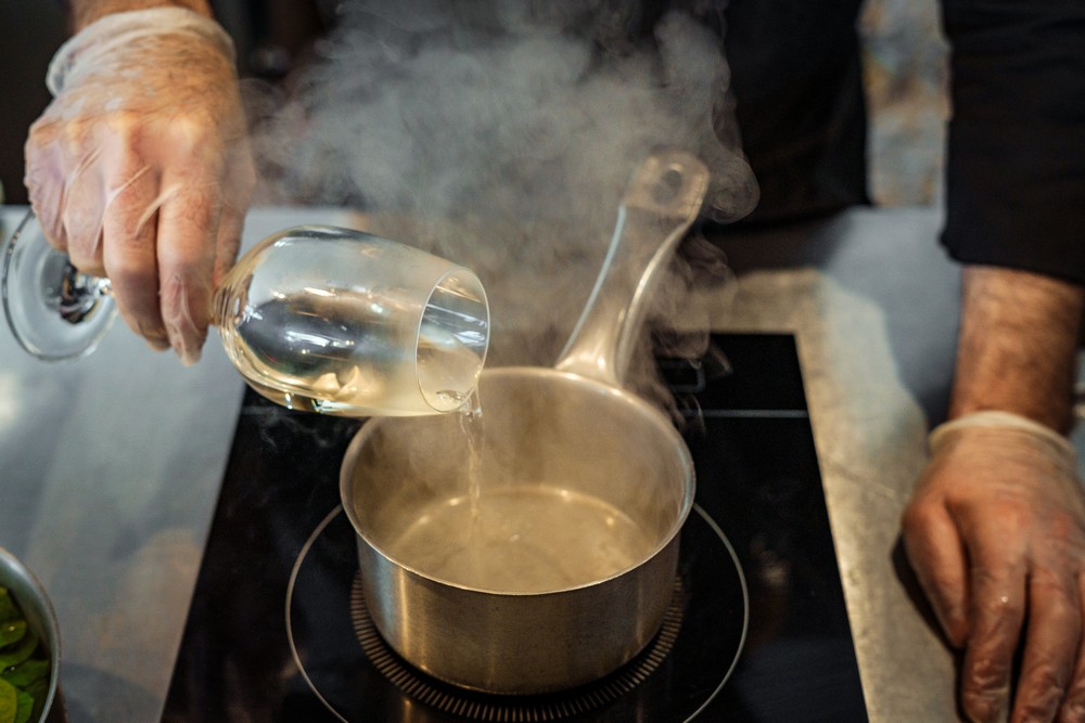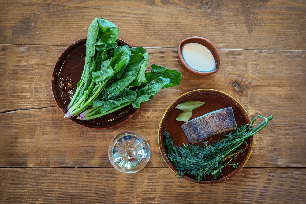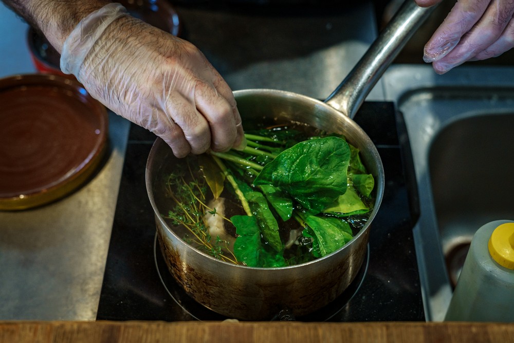 — Все ингредиенты для рассола соедините и доведите до кипения. Снимите с огня и сразу положите туда филе палтуса и шпинат. Оставьте на десять минут.