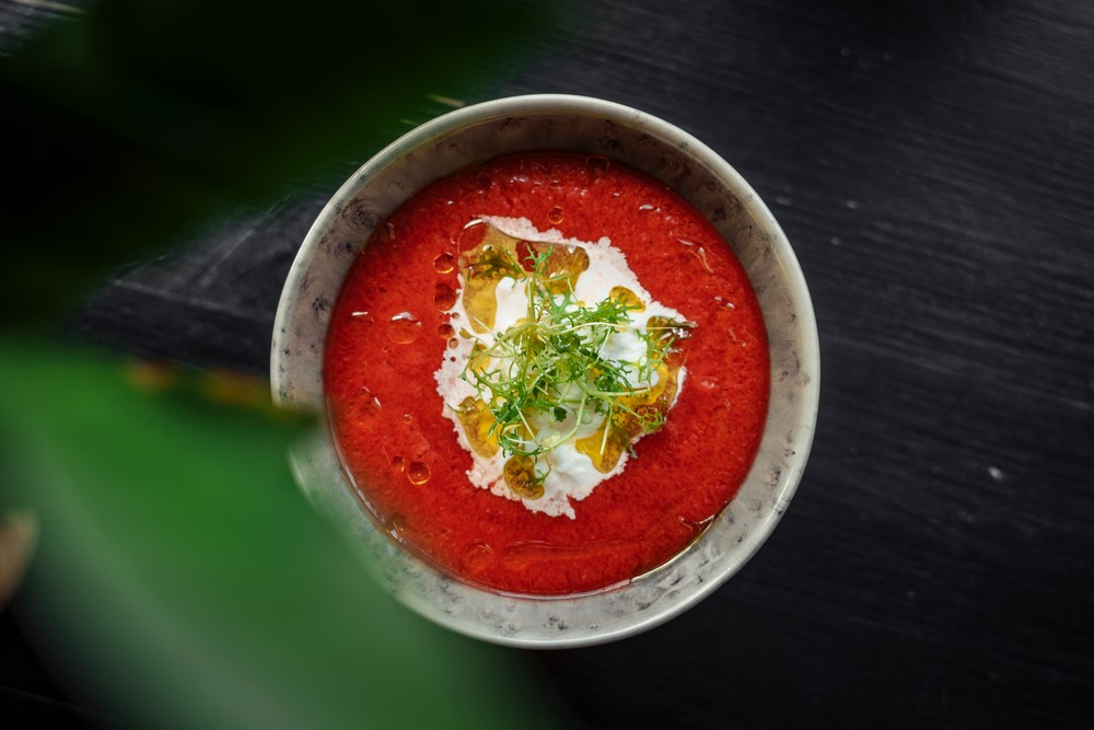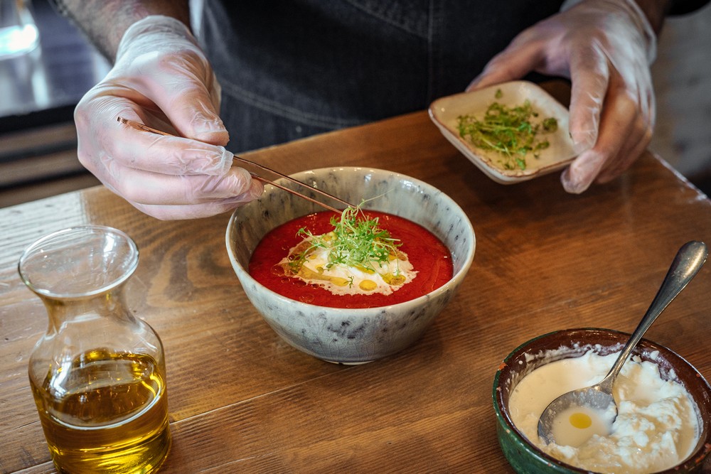 — Налейте в глубокую тарелку гаспачо, сверху по центру положите пару столовых ложек страчателлы, украсьте зеленью и сбрызните оливковым маслом.