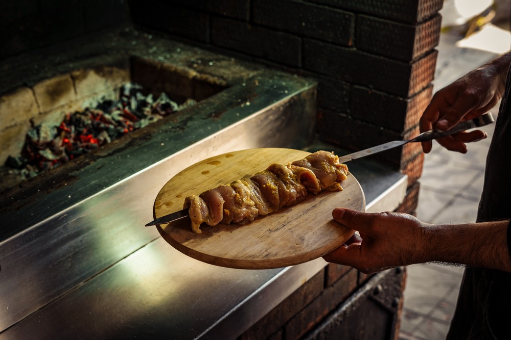 — Наденьте маринованные кусочки курицы на шпажки и обжарьте на гриле примерно по 5-7 минут с каждой стороны.