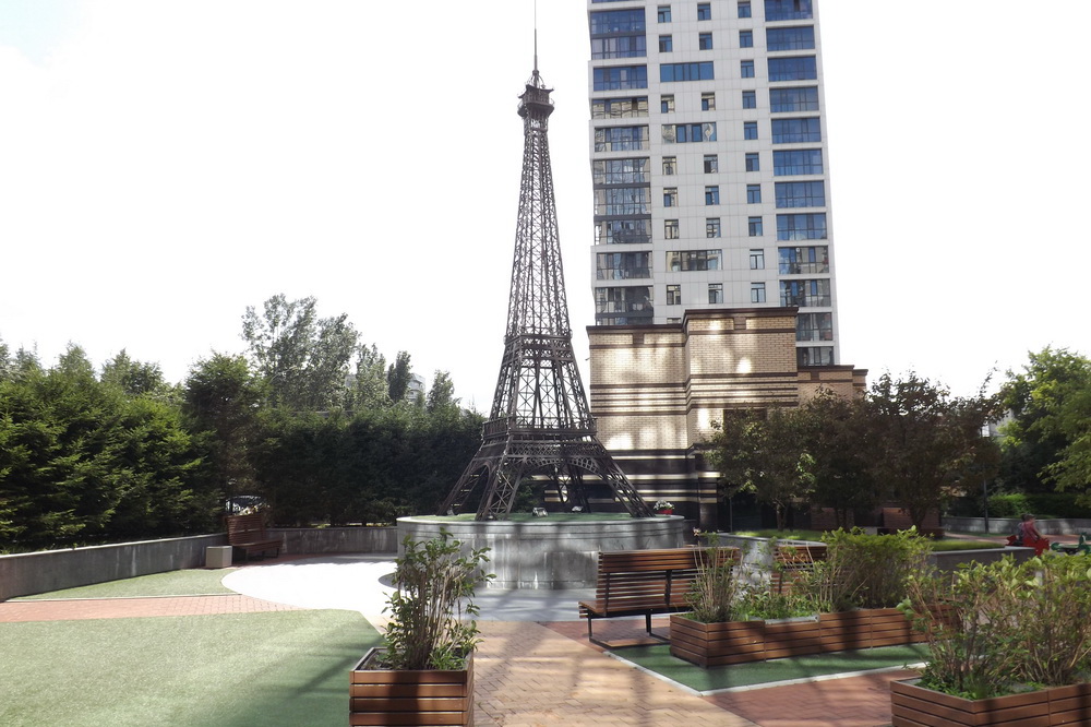 Эта башня смотрится очень символично на фоне магазина парфюмерии и косметики с французским названием. К тому же здесь есть лавочки, где можно посидеть и представить, будто вы действительно в Париже.
