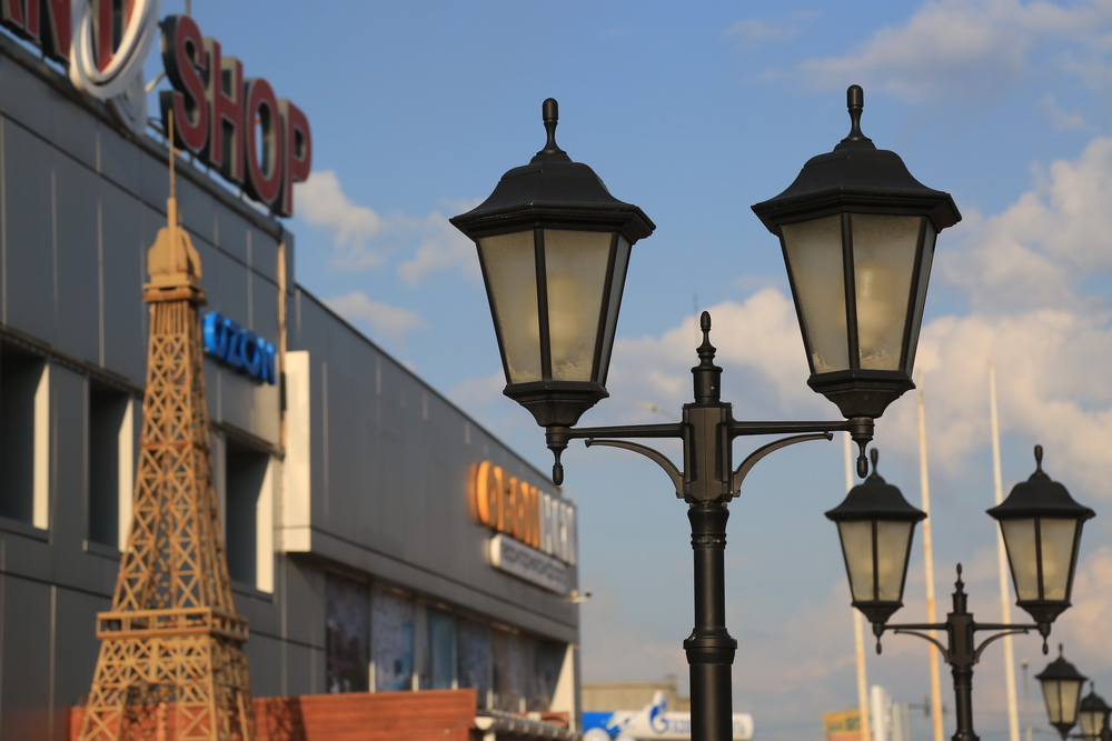 Небольшой островок у входа в магазин цветов — одна из самых известных фотозон в городе. Здесь много красивых композиций, которые собирают сотни лайков любителям заселфиться. Эйфелева башня занимает почётное место на площадке уже не первый год. Конструкция совсем небольшая и от этого кажется особенно хрупкой. Ночью она освещает тротуар невероятным цветом. Можно присесть рядом и загадать, например, желание поехать в Париж.