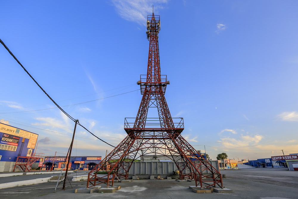 Башня-долгожительница: её поставили в 2003 году на территории оптово-розничного комплекса, чтобы привлечь покупателей. Есть у сооружения и практическая функция: на нём размещены передатчики сотовой связи. А ещё это самая высокая Эйфелева башня в Новосибирске. Её размер — 22 метра.