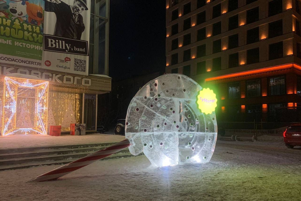 Необычный арт-объект появился перед концертным комплексом имени Маяковского. Трёхметровую конфетку изо льда установил телеканал «Суббота!».