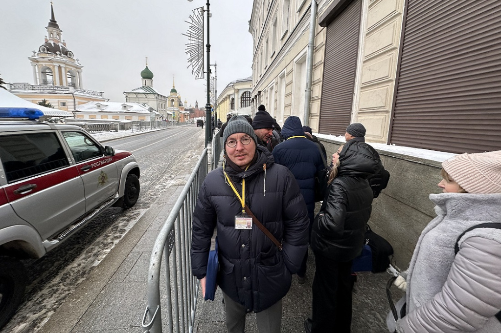 Сейчас он уже находится в пресс-центре на территории Гостиного двора. Чтобы попасть туда, пришлось около часа на лёгком морозе отстоять в очереди на допуск. По словам Ивана Проскурина, журналистов из регионов приехало много, тщательная проверка шла на нескольких постах.