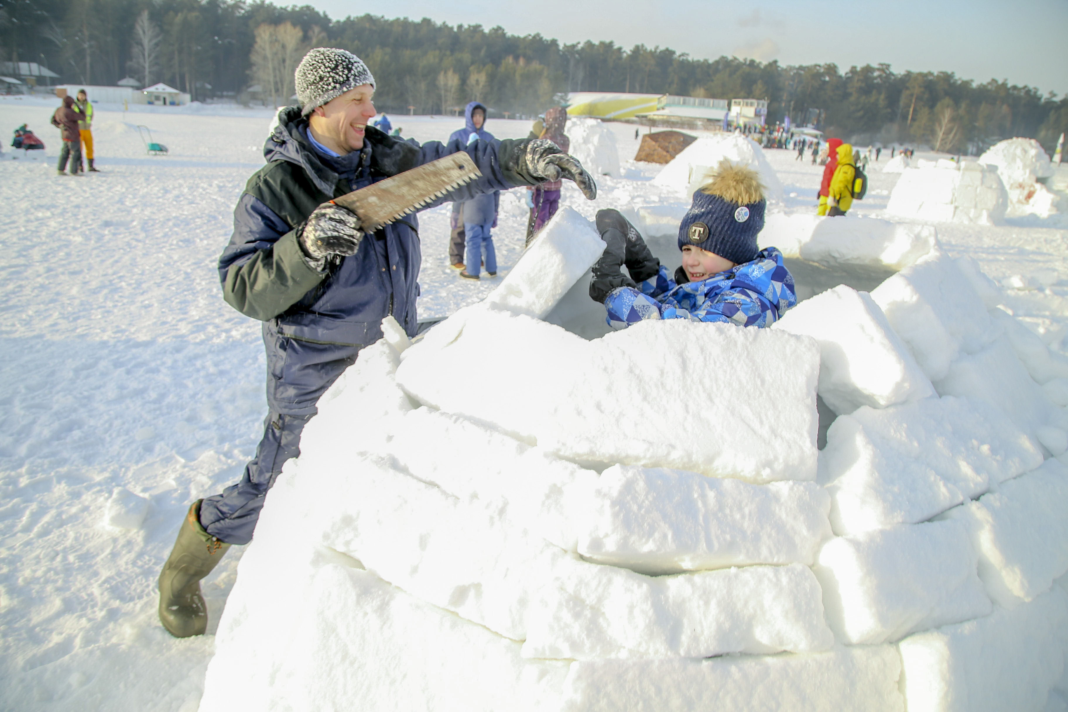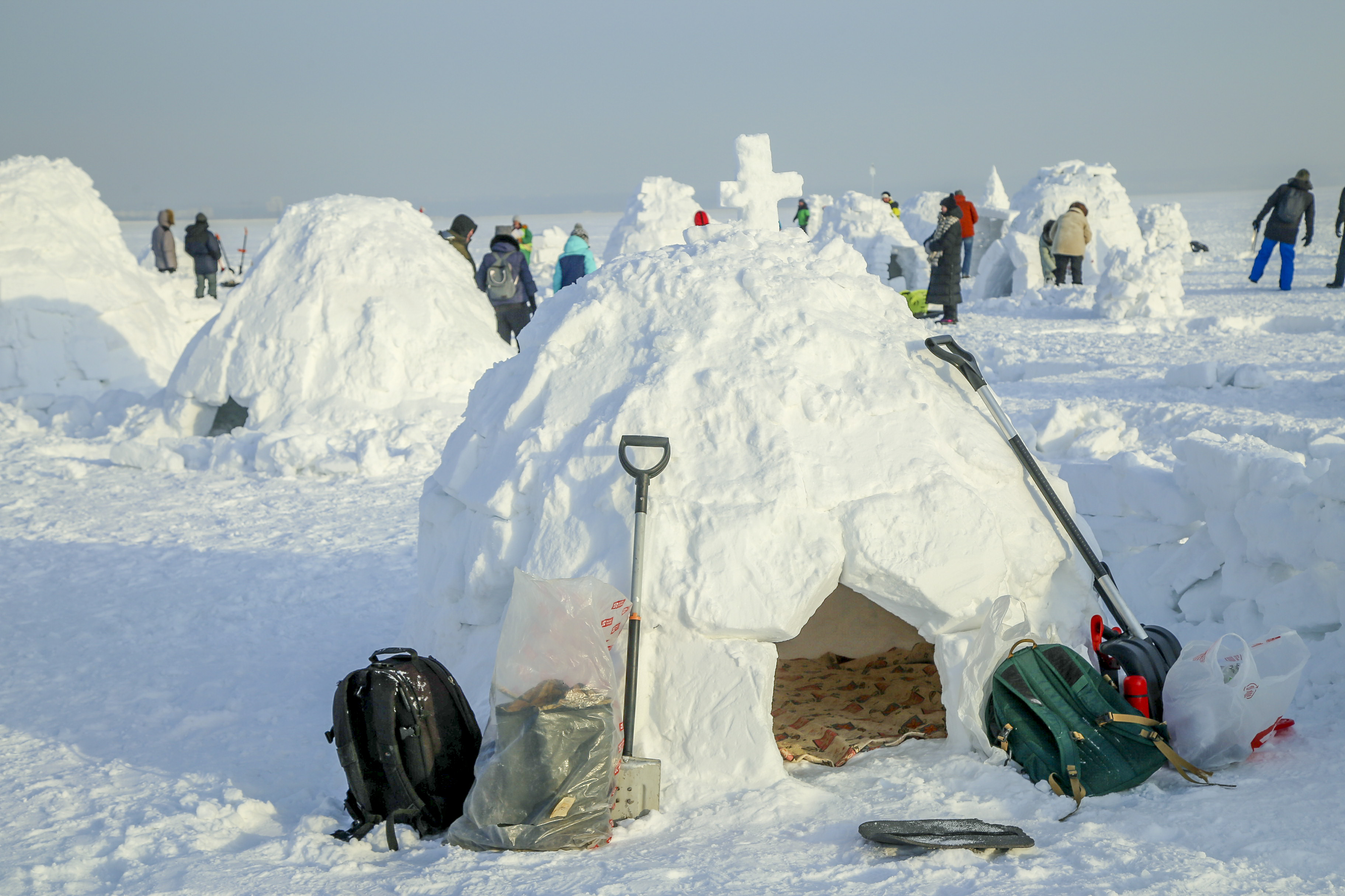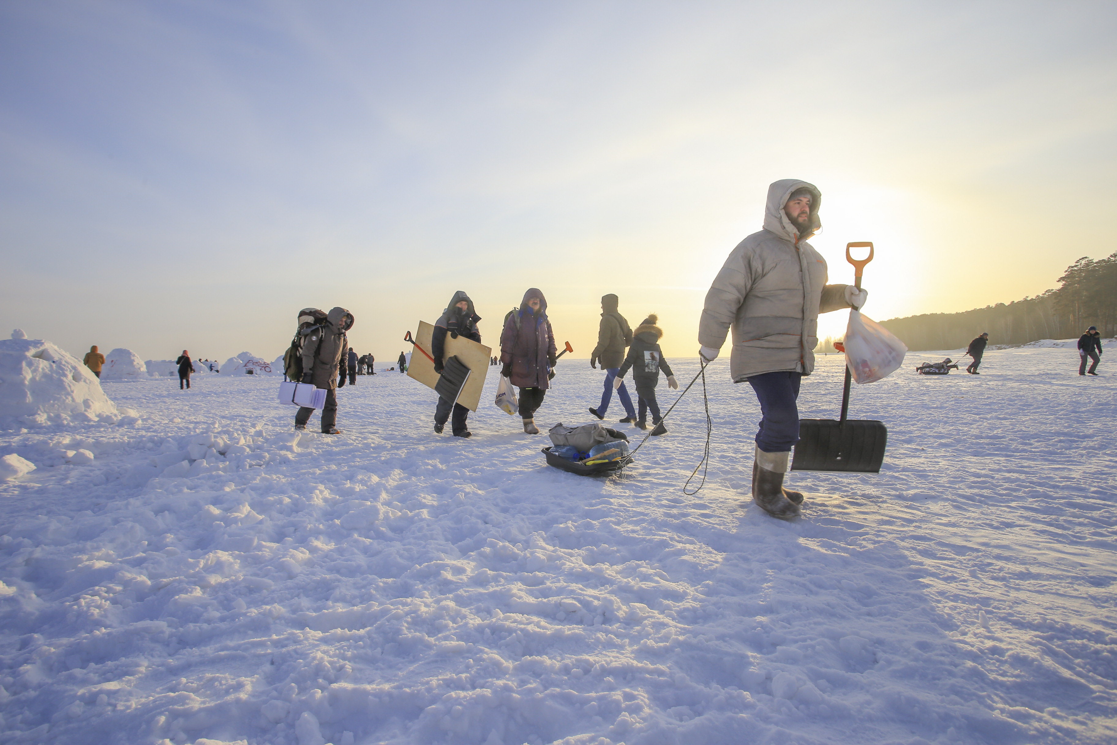 Новосибирцы построили снежные здания, в которых можно ночевать. Традиционный фестиваль иглу прошёл в субботу, 13 февраля. На льду Обского моря выросли десятки домиков из снежных кирпичей. В полдень, когда начались соревнования, столбик термометра застыл на отметке в −30 градусов. Но мороз участников не испугал.