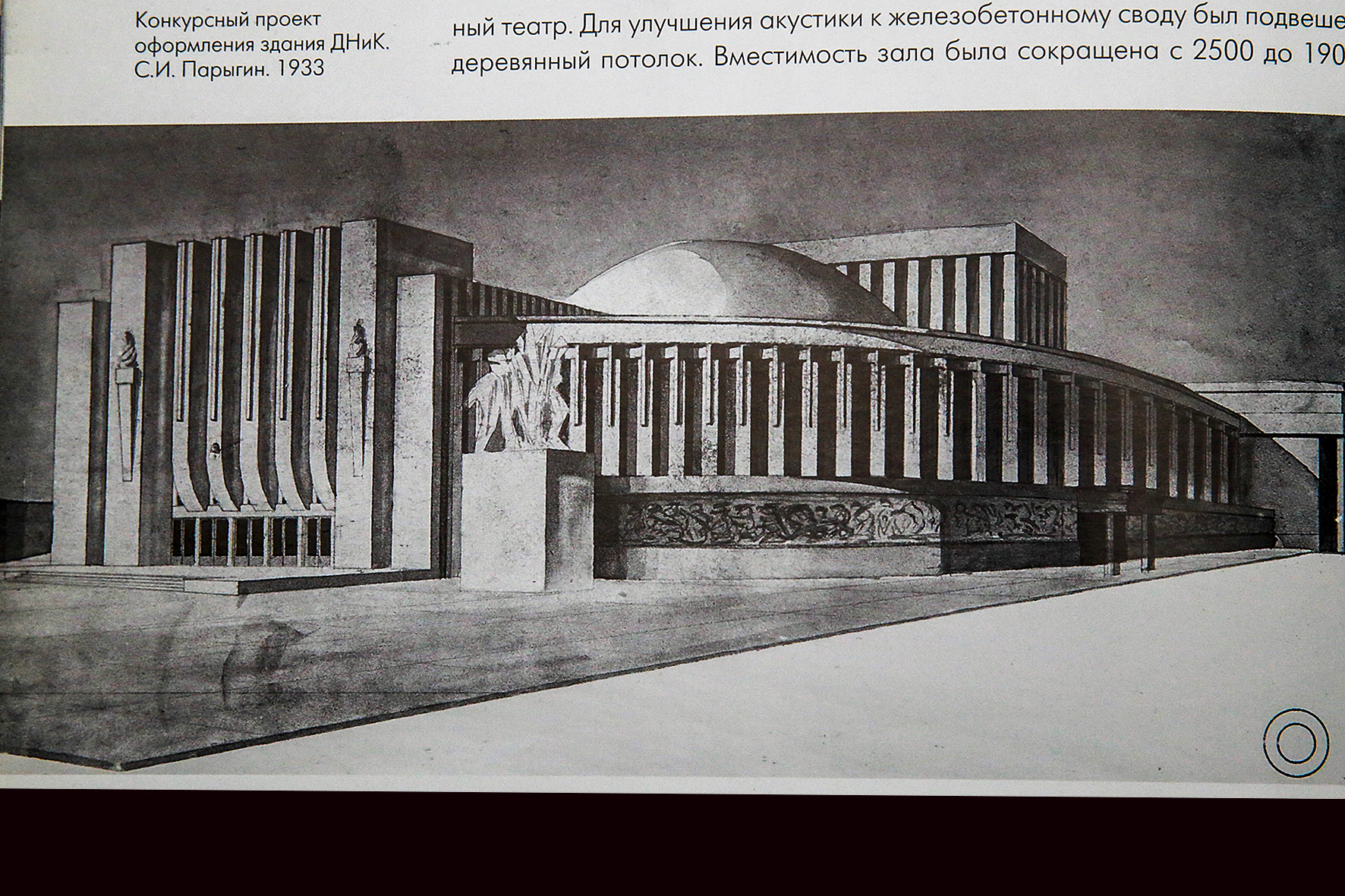 Изначально задуманный в Новосибирске объект совмещал в себе театр, цирк на воде, кино, музей и конгресс-зал. Это многофункциональный комплекс с советской идеологией. Первый проект — это авангард. Направление — функционализм. В одном из вариантов нет купола. В другом — голый купол без привычной чешуи. И таких проектов было около 20.