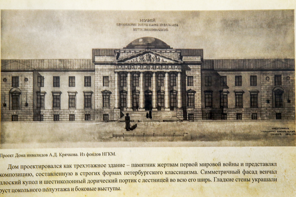 Это проект богадельни, которую хотели построить на месте нынешнего Дома офицеров на Красном проспекте, 63. Тоже работа Андрея Крячкова. По проекту здание называлось «Музей европейской войны и Дом инвалидов». Там планировали жильё для покалеченных ветеранов первой мировой, музей и церковь. Но из-за отсутствия денег проект не реализовали.