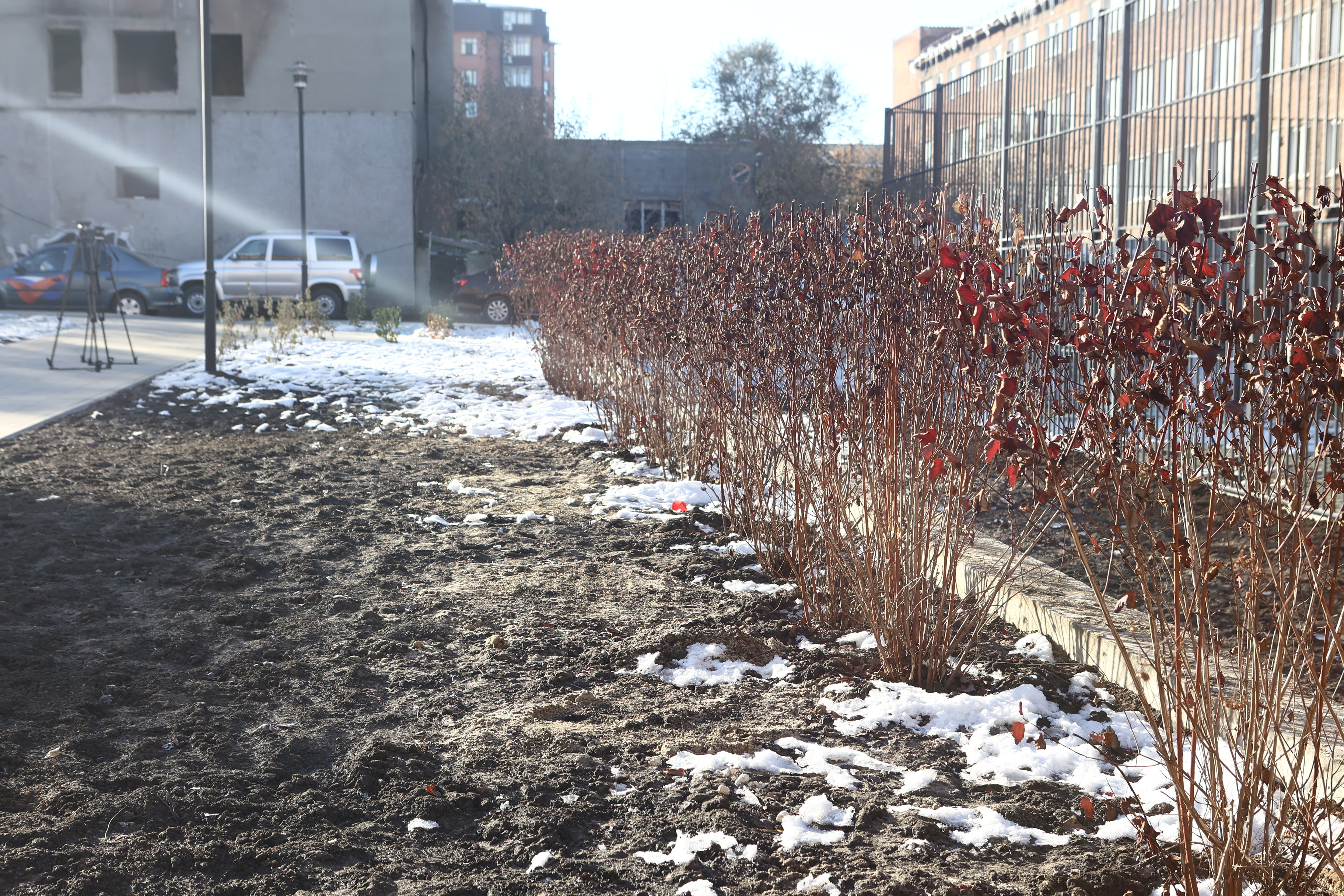 Почти завершено озеленение. В сквере уже появились клёны Гиннала, кизильник, сирень и многолетние цветы.