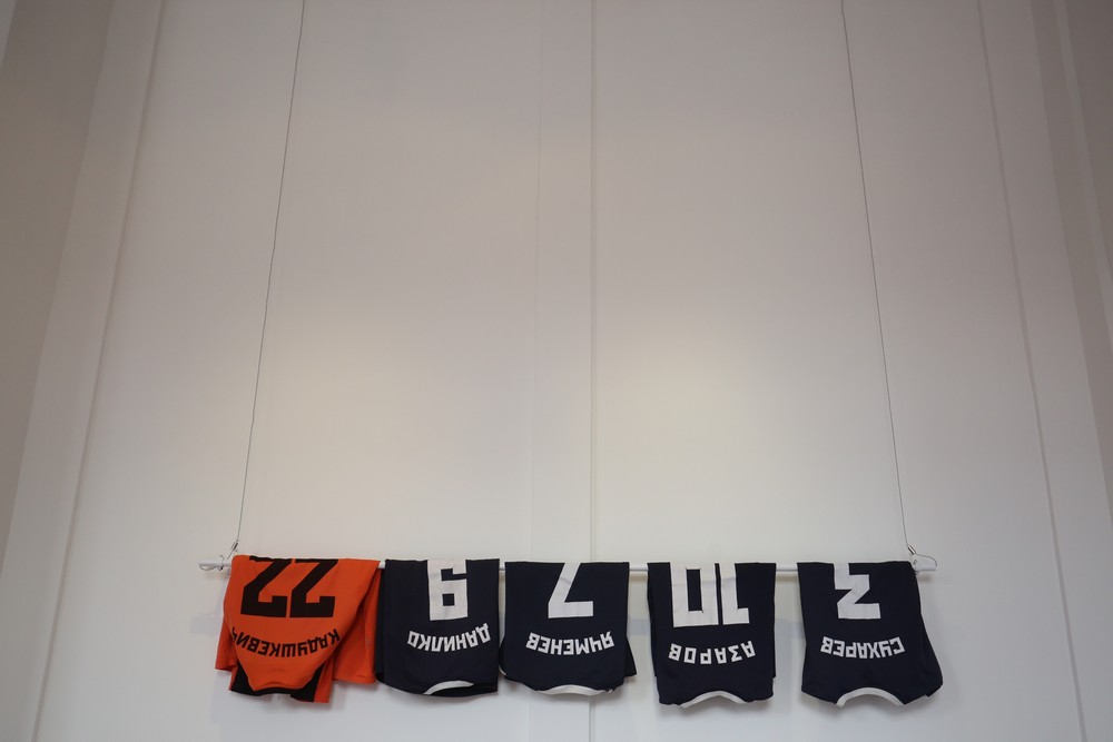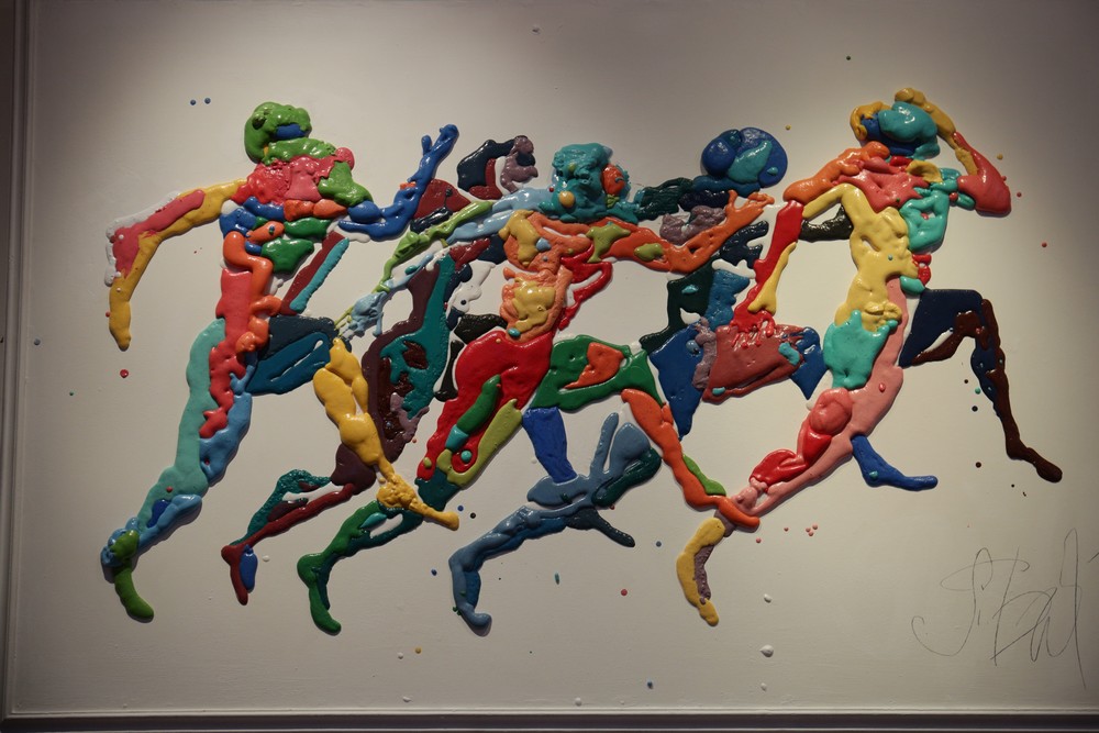 Среди авторов не только дизайнеры и художники, но и футболисты. Они уверены: спорт — тоже искусство. На этих полотнах — линии маршрутов футболистов по полю во время игры. Метафора того, что художники рисуют кистью, спортсмены же — одновременно и творцы, и инструменты.