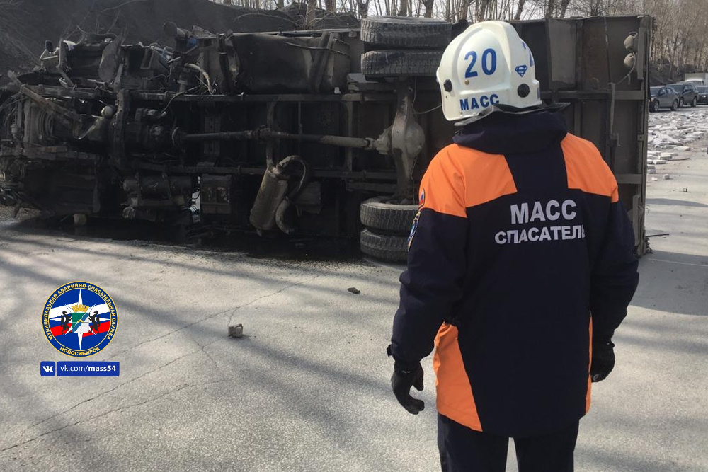 «Isuzu Forward наехал левыми колесами на разделительный бордюр, после чего снёс опору освещения и свалился на правый бок», — сообщили в муниципальной аварийно-спасательной службе Новосибирска.