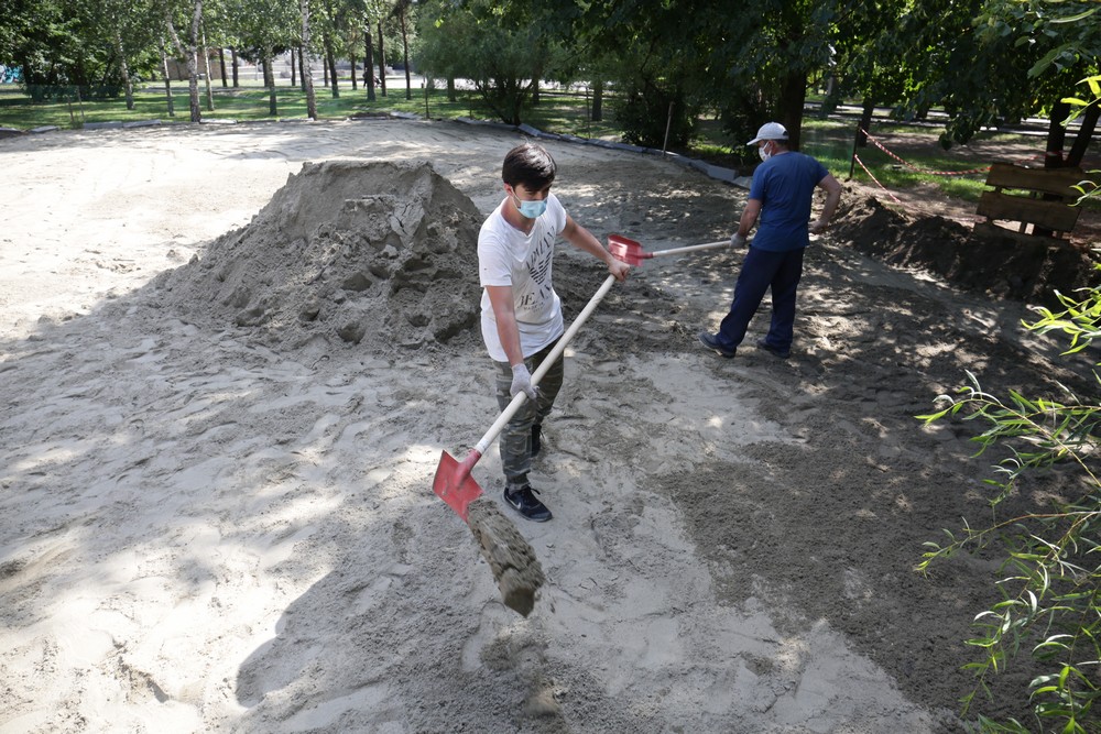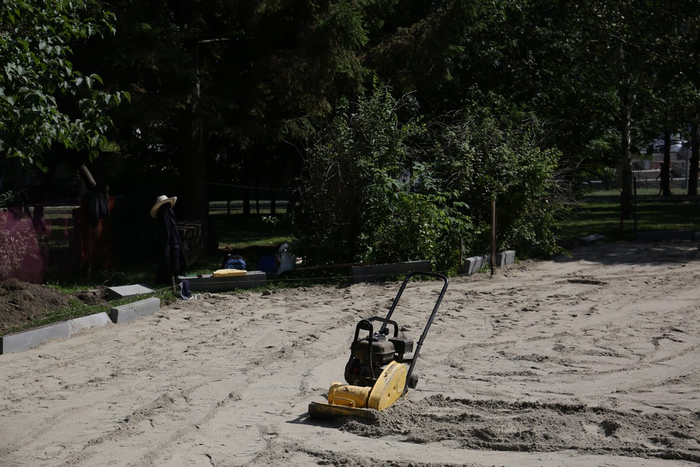 Строители укладывают песчаную подушку, она станет основанием будущей площадки, позже уложат прорезиненное покрытие и установят сами игровые формы.