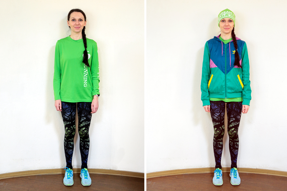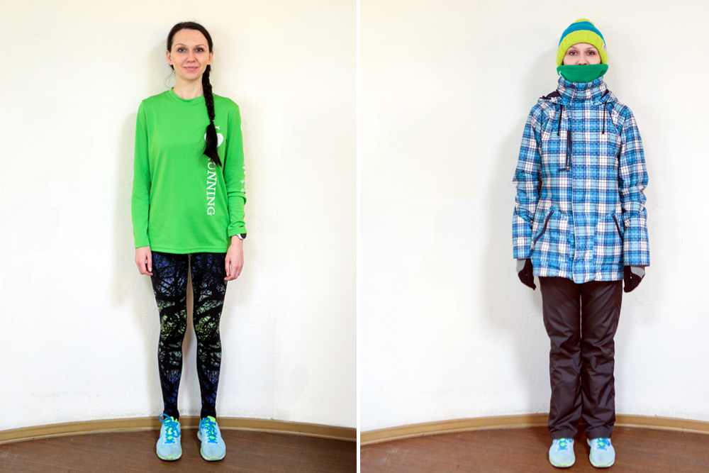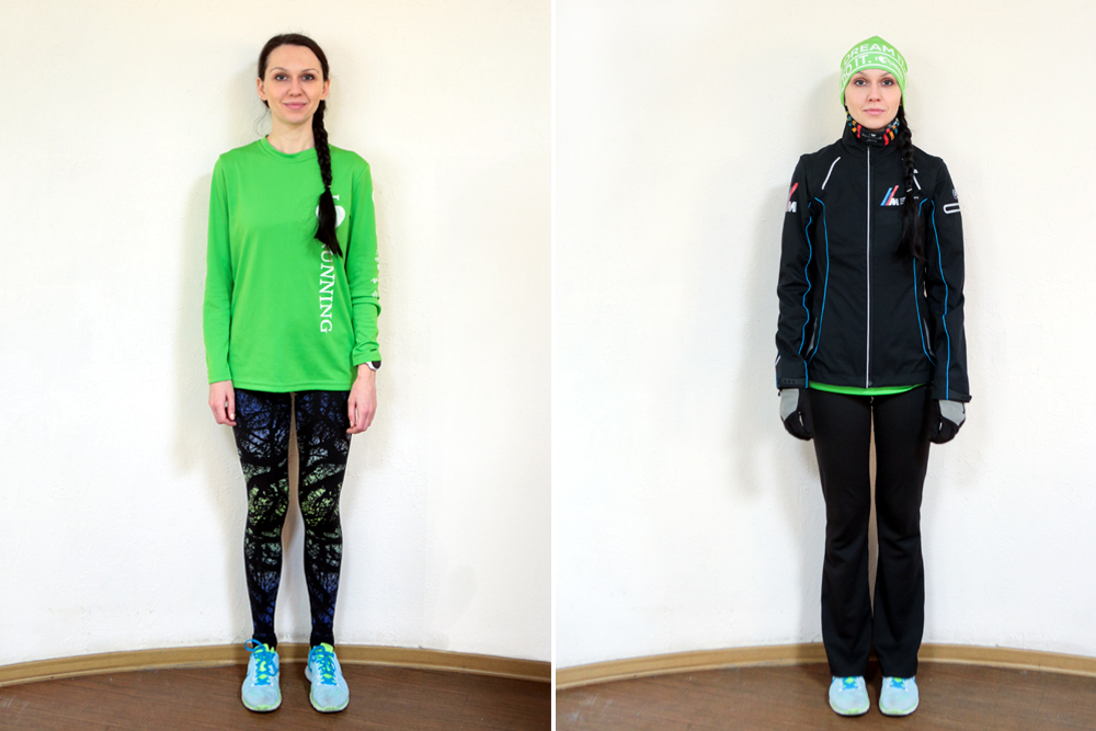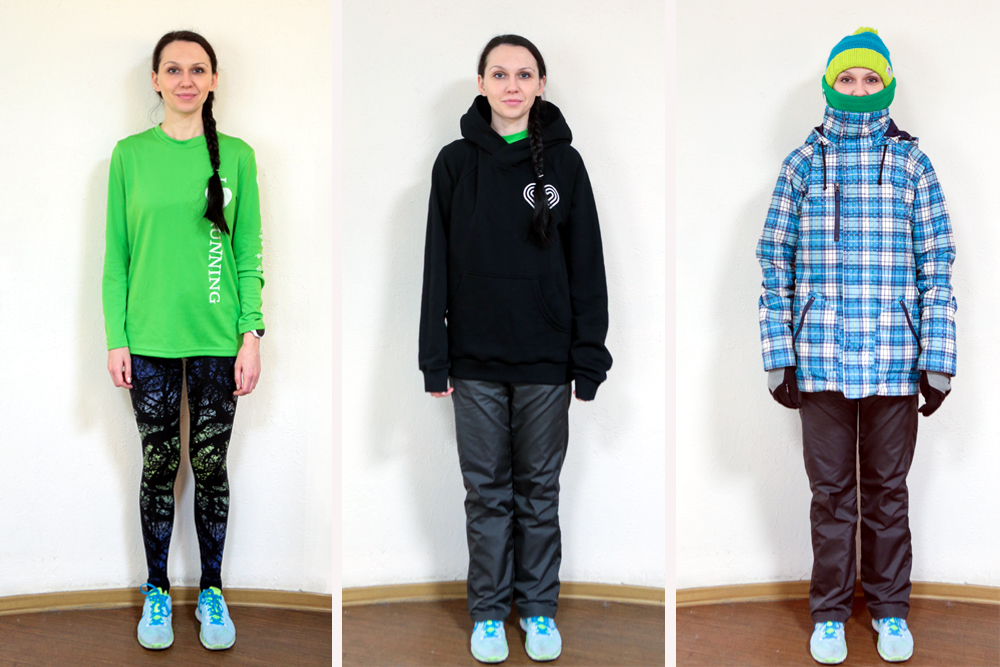 На Наташе: легинсы, синтетическая футболка с длинным рукавом, беговые штаны, носки, кроссовки, шапочка, бафф, непродуваемая куртка.