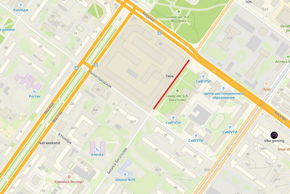 Новосибирцев предупредили об ограничении проезда в Октябрьском районе. Оно коснулось улицы Бориса Богаткова. Её перегородили у здания с адресом улица Кирова, 82 (это СибГУТИ).