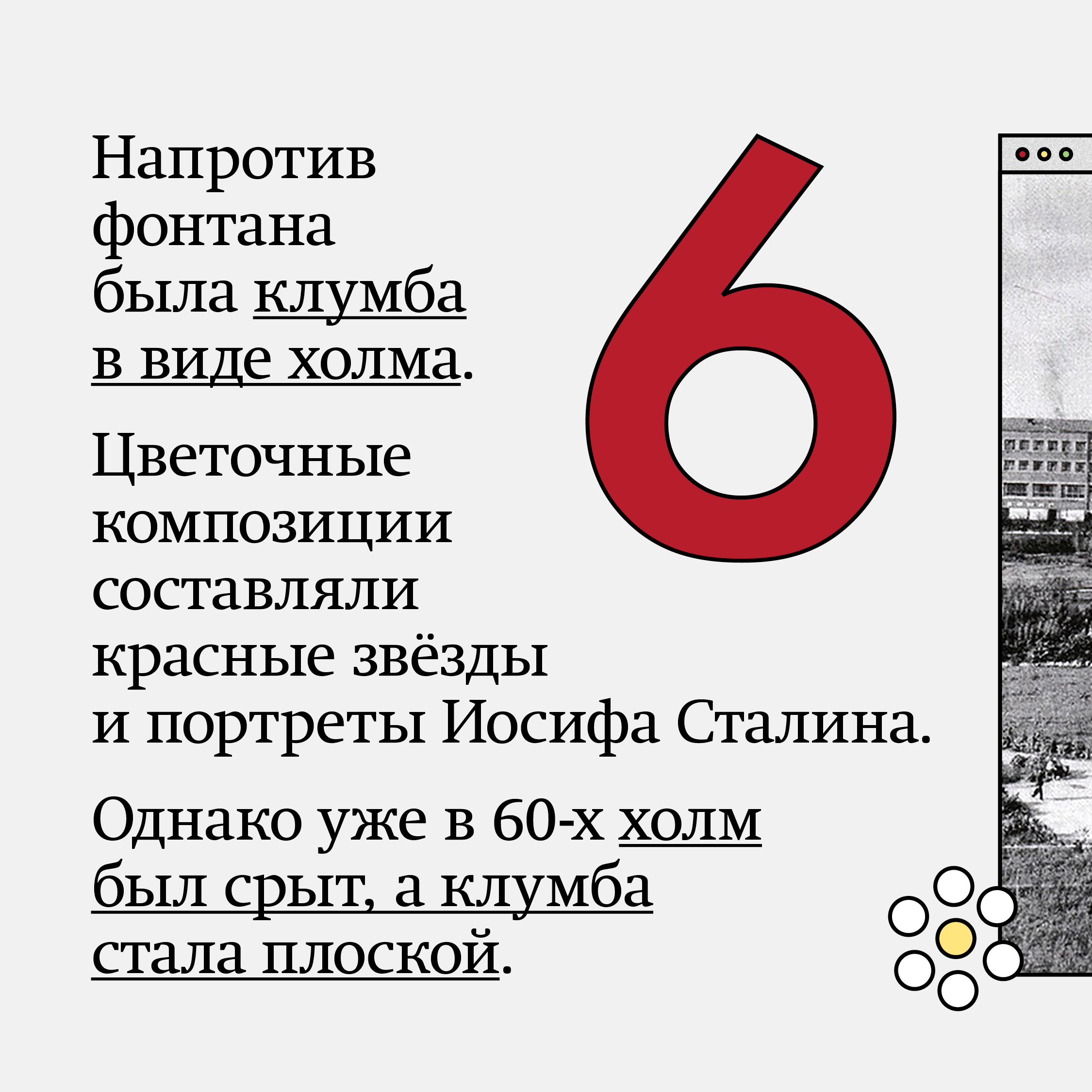 Напротив фонтана была построена центральная клумба в виде холма. Цветочные композиции составляли красные звёзды и портреты Иосифа Сталина, однако уже в 60-х холм был срыт, а клумба стала плоской.