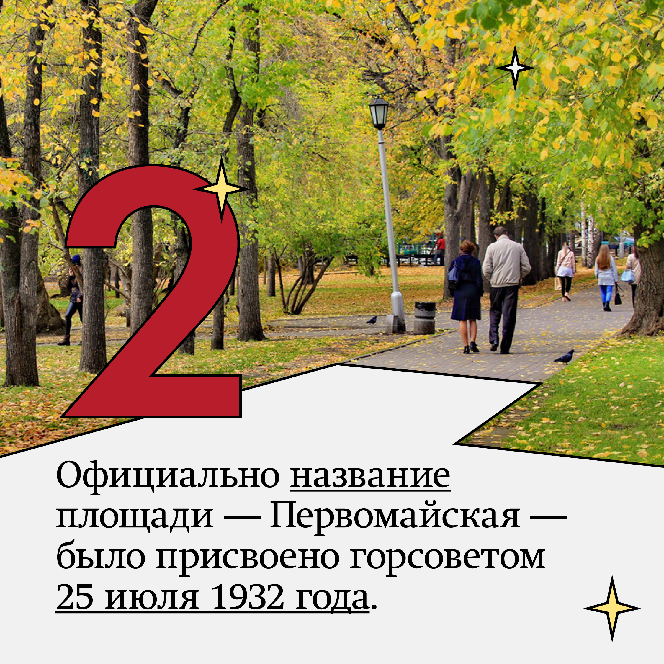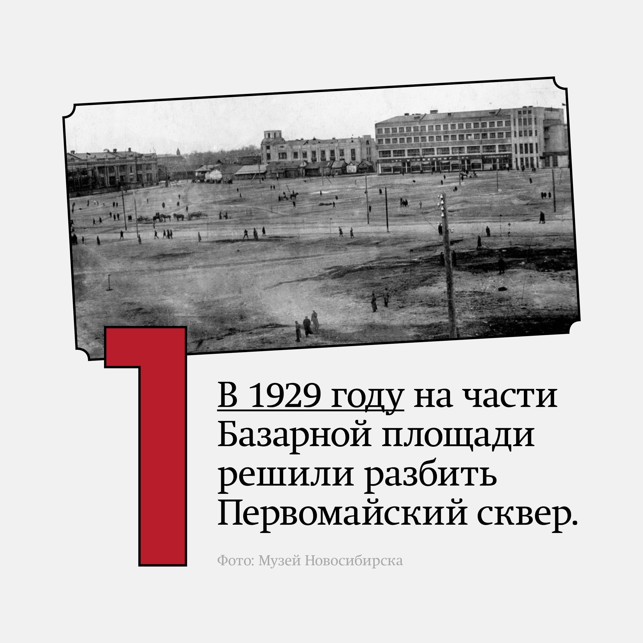 Горкомхоз начал сносить деревянные строения, расположенные напротив Дома Ленина по Красному проспекту, освобождая место для сквера. В начале это было песчаное, совершенно голое место – Первомайская площадь. Официально название площади — Первомайская — было присвоено горсоветом 25 июля 1932 года.