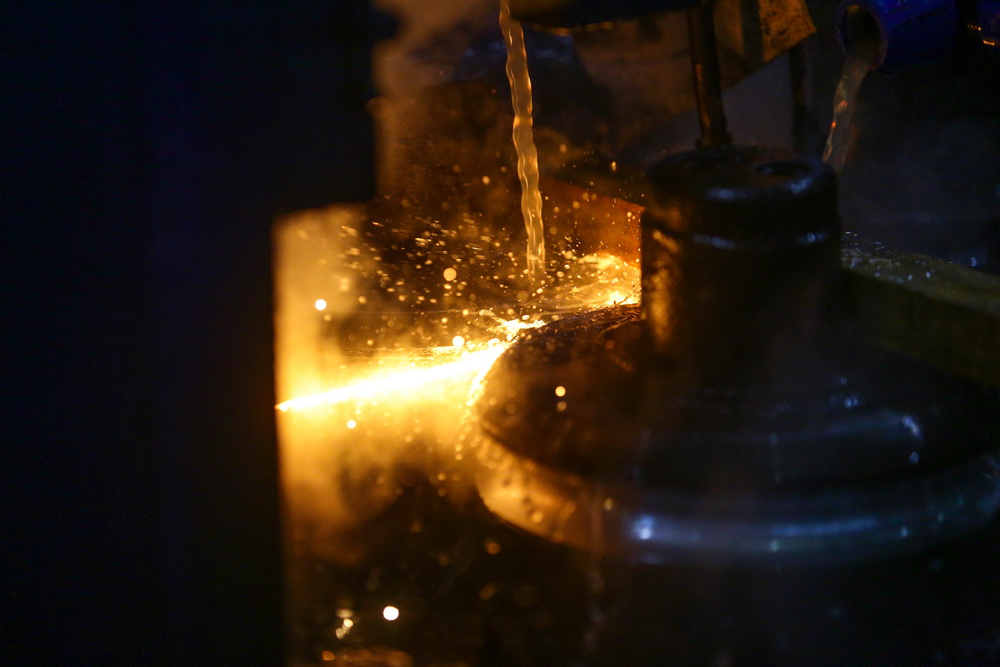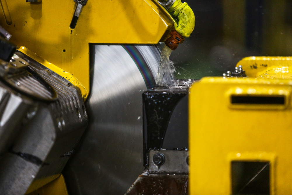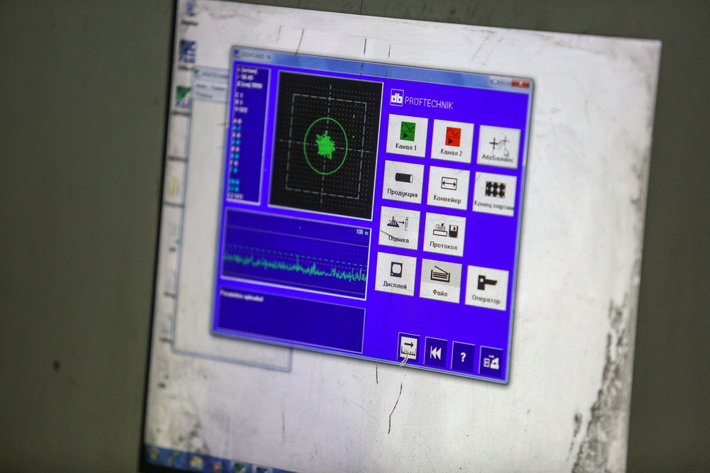 Здесь вкалывают роботы — человек только контролирует. Металлическую ленту сжимают в трубу вращающиеся части, дальше — сваривают. Температура — 800 градусов. Охлаждение и свой контроль качества, встроенный в линию. Пила задействована на финишной части работы. Подхватывает заготовку и ведёт, параллельно отпиливая мощным диском.