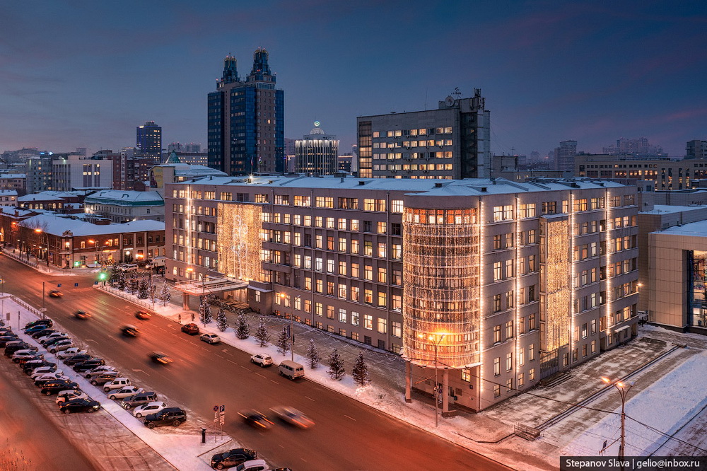 Известный фотограф Слава Степанов снял новогодний Новосибирск с высоты. В кадр попали здания в центре города, освещённые праздничной иллюминацией.