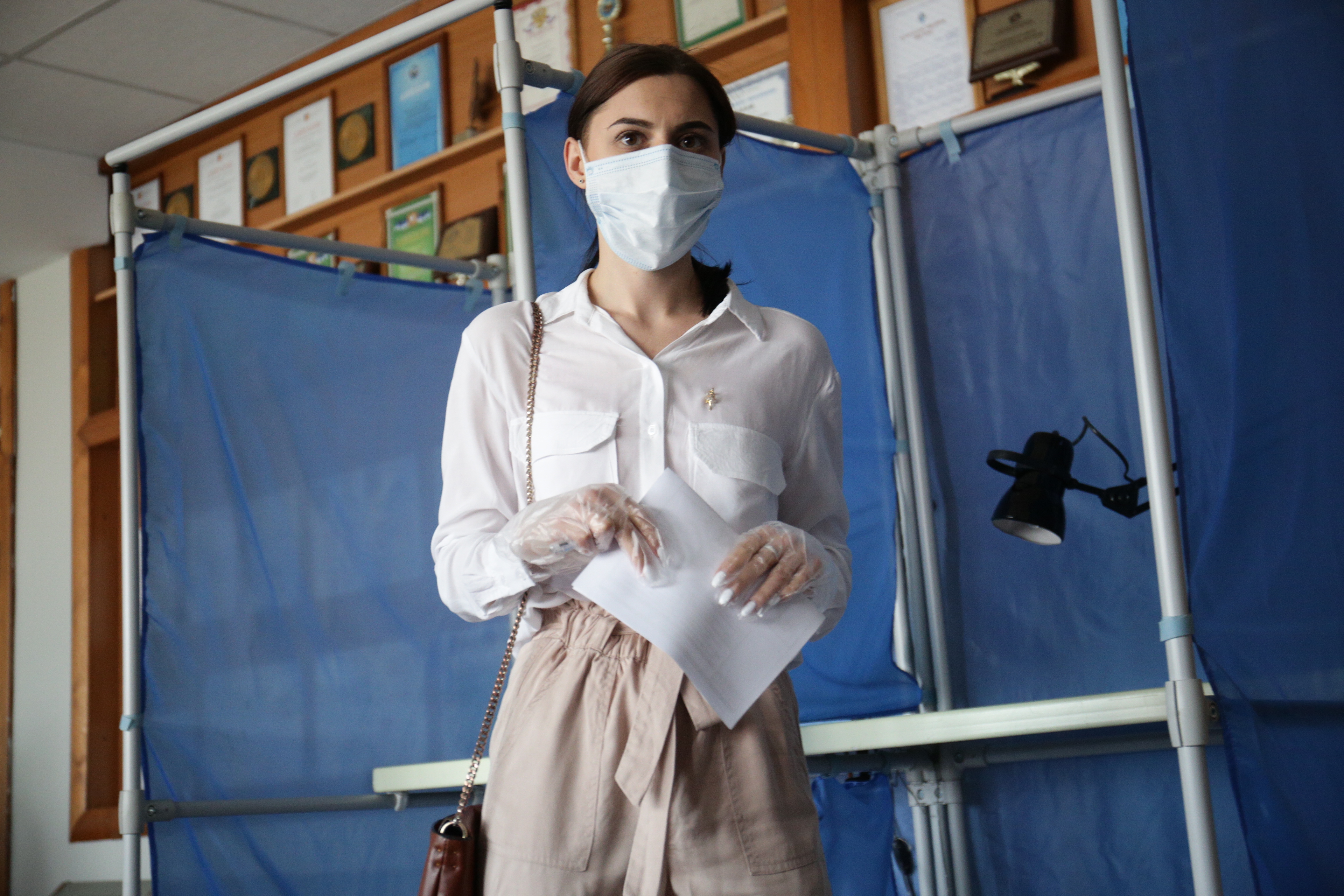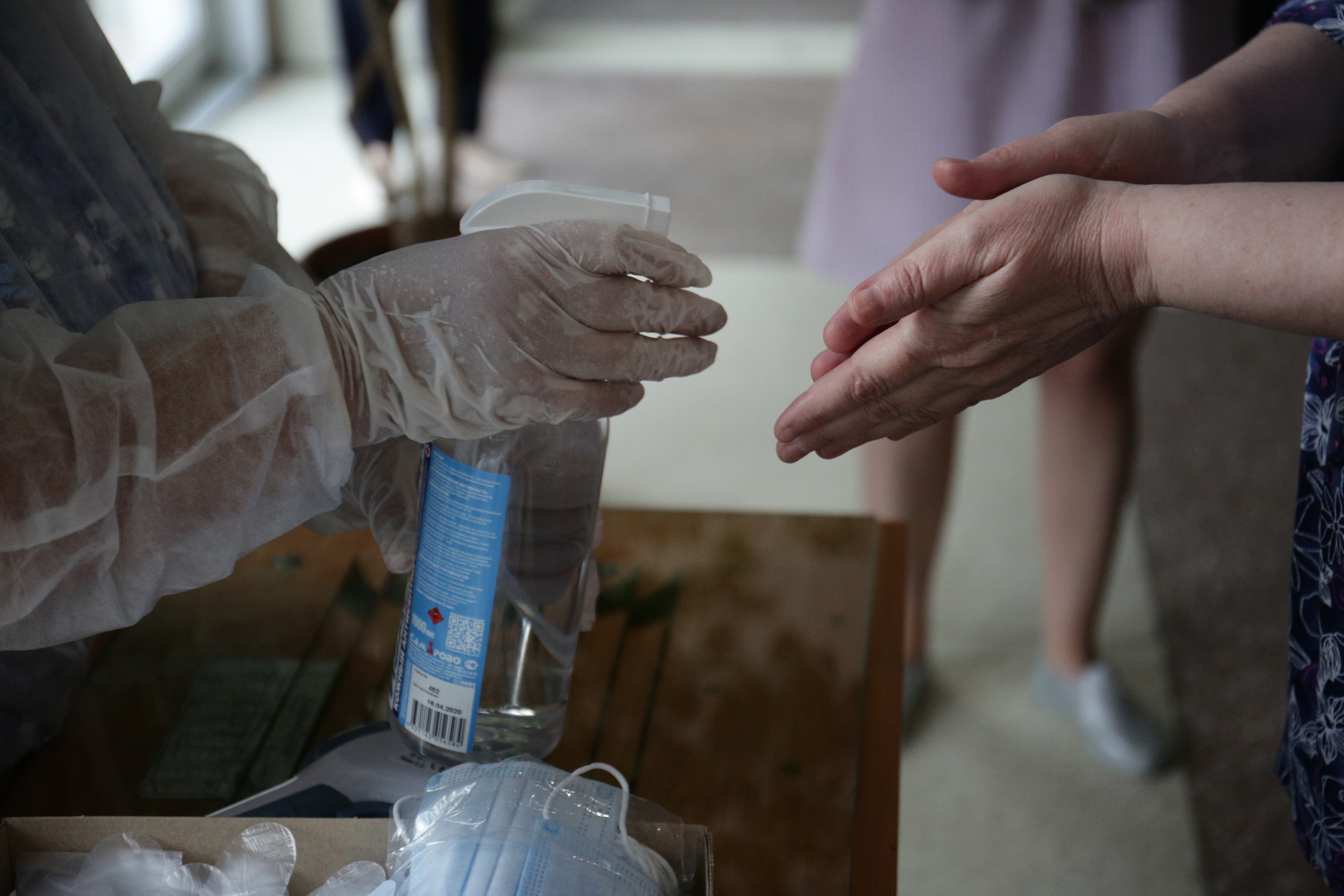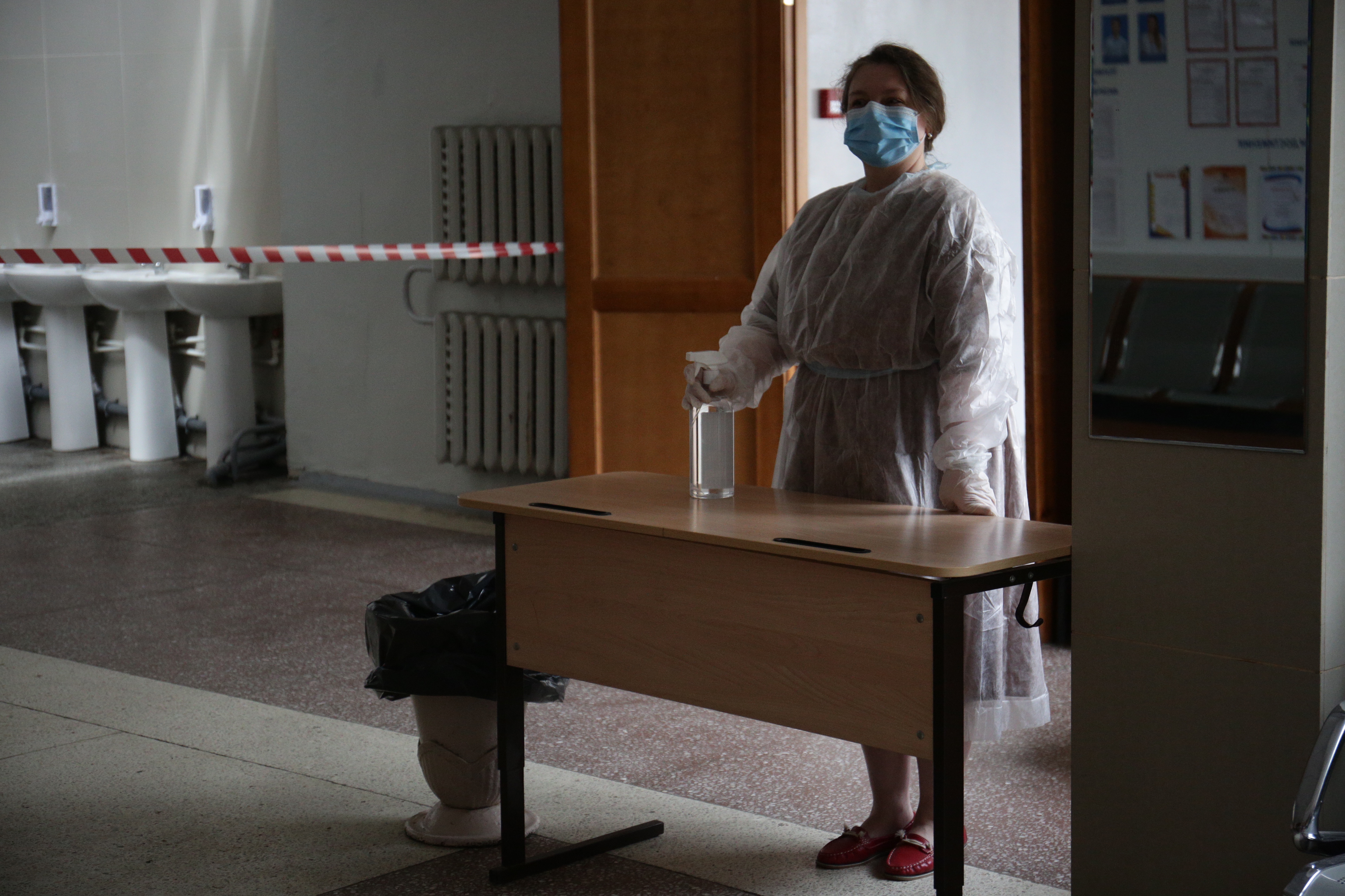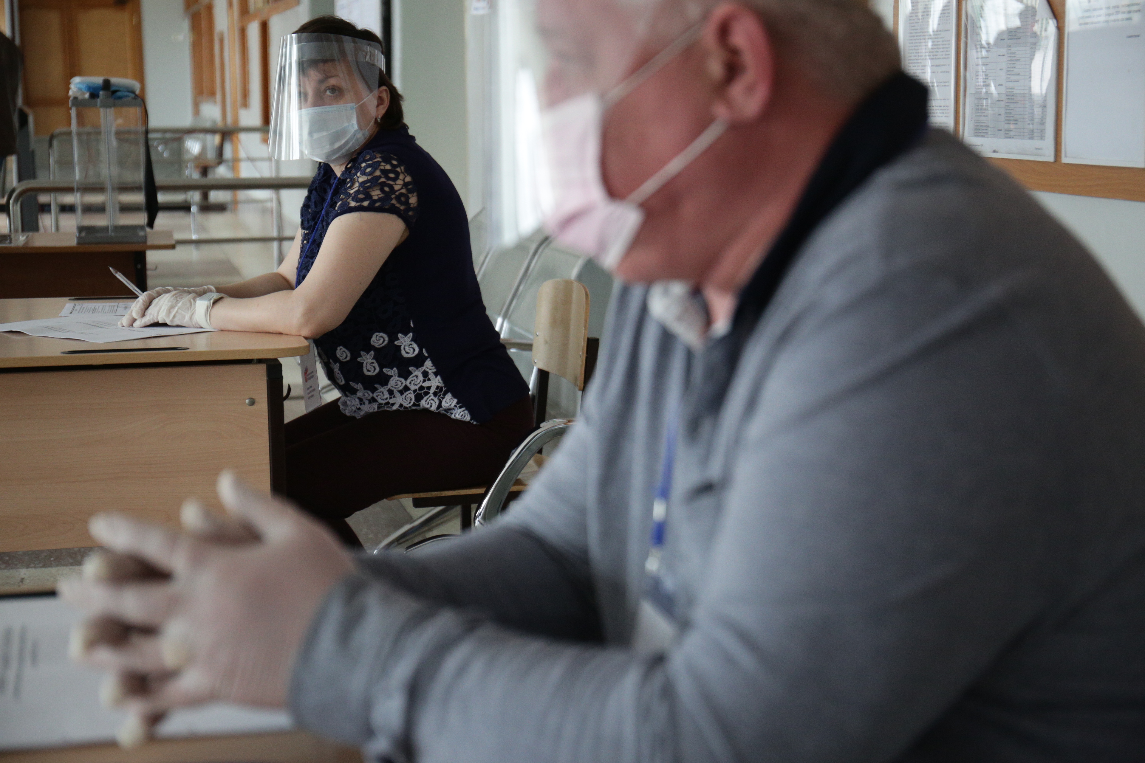 На избирательном участке голосующий сначала проходит через рамку металлоискателя, а затем идёт к столу, где специально обученный сотрудник измеряет температуру. Необходимо продезинфицировать руки, и избирателю выдают средства индивидуальной защиты — маску и перчатки.