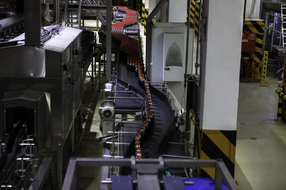 Бутылки идут по ленте стройными рядами, словно солдаты на параде.