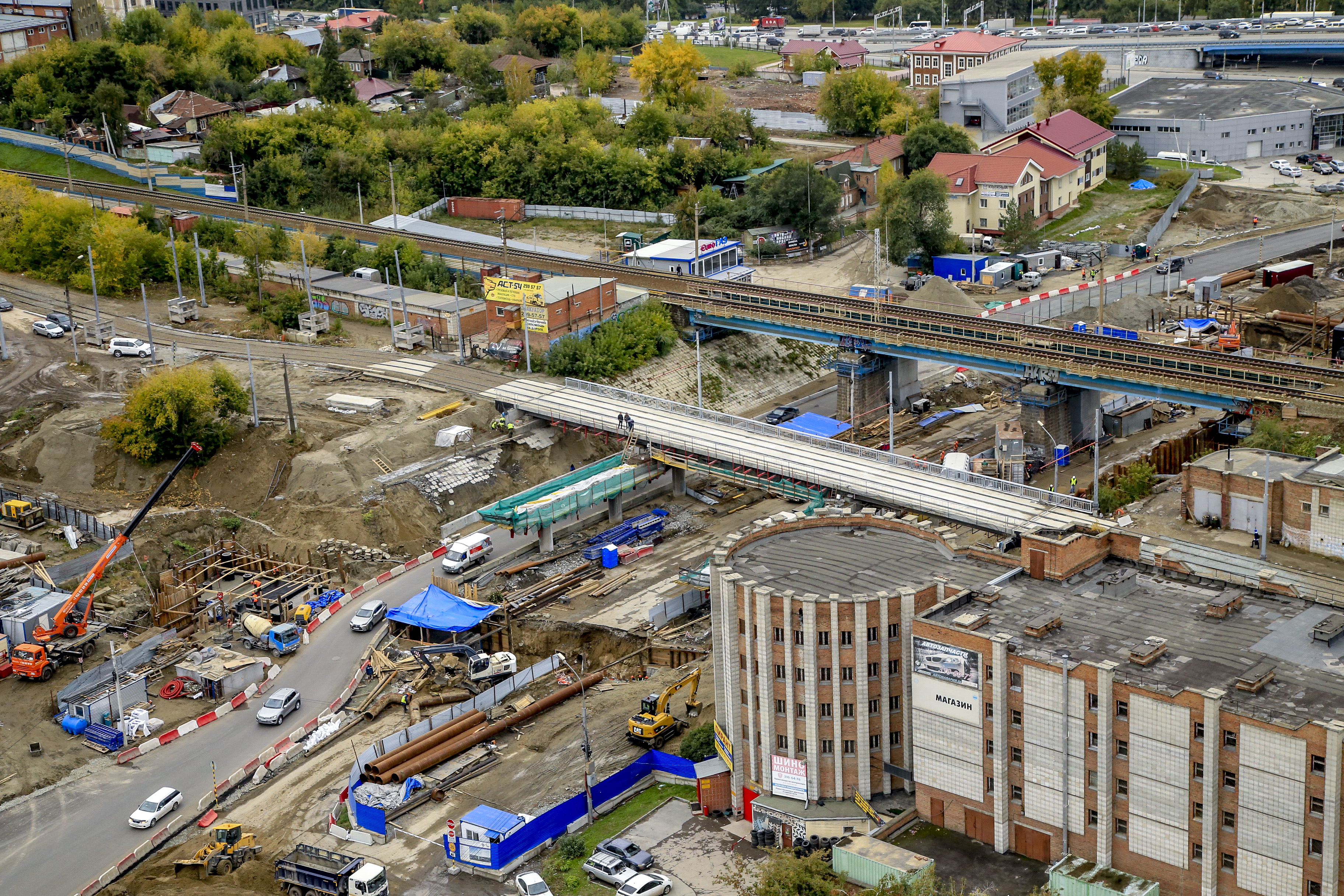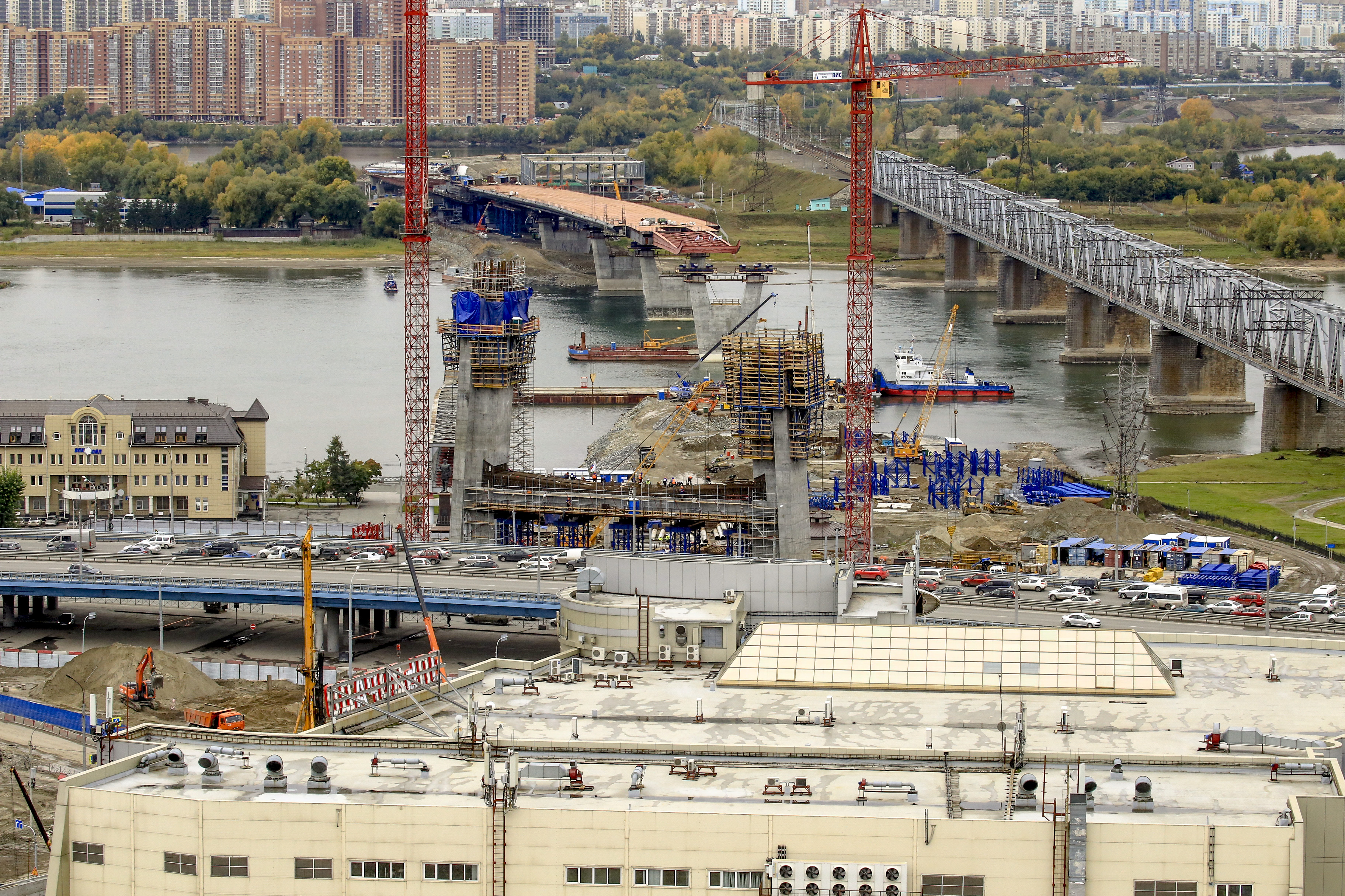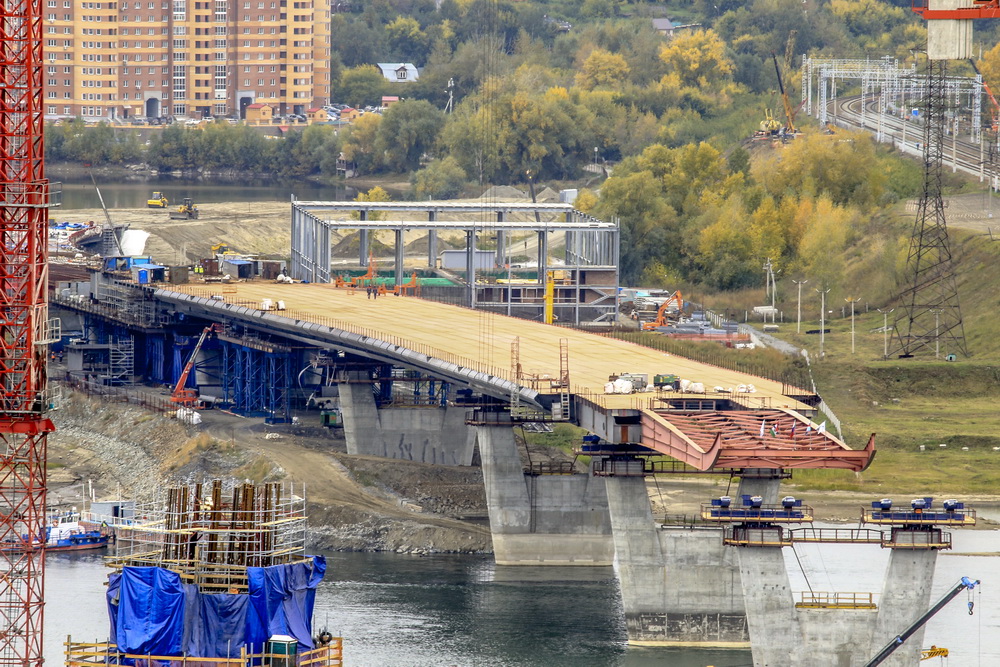 Пролёты четвёртого моста собирают на левом берегу и постепенно надвигают на опоры в сторону правого. На сегодня строителям удалось надвинуть конструкции на две опоры. А всего их в русле будет четыре. Три готовы полностью, четвёртую сейчас строят. Специально для неё по соседству с парком «Городское начало» насыпали 100-метровую дамбу.