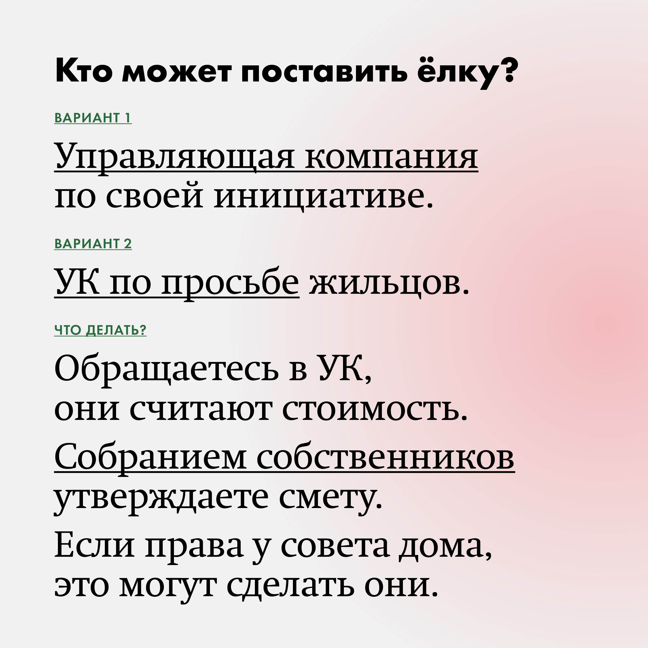 К кому обратиться для установки ёлки, можно ли украсить двор и подъезд электрической гирляндой, как залить каток — алгоритм действий смотрите в наших карточках.