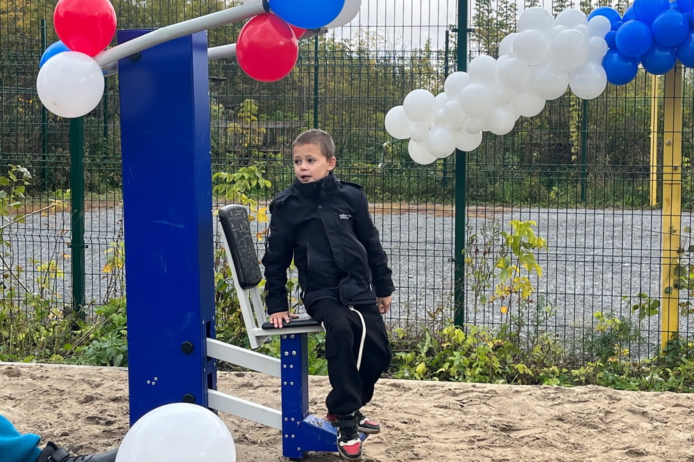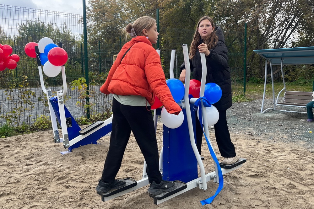 На площадке установили оборудование для занятий спортом и качели для отдыха.
