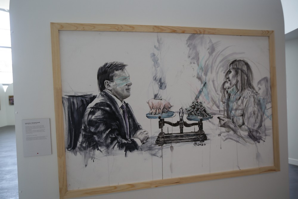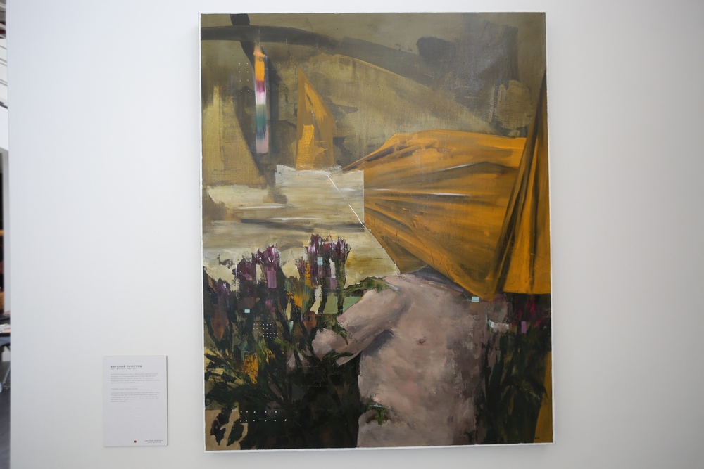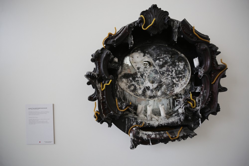 Ощутить запах свеч от работы «Картина города» Анастасии Вовчанской. Под слоем серой краски и воска — круглое настенное советское зеркало. Метафора зацикленности на прошлом.