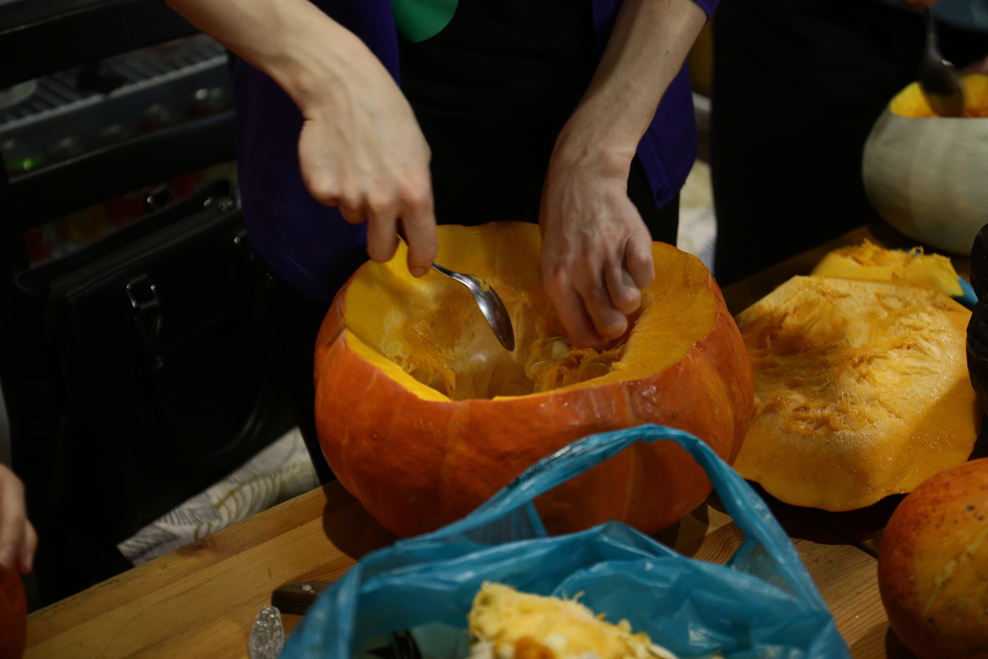 Через полученное отверстие достаём внутренности тыквы. Лучше всего это делать ложкой. Голова Джека должна оказаться полностью пустой изнутри.
