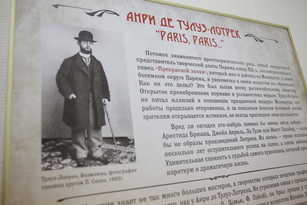 На выставке «Анри де Тулуз-Лотрек. Paris, Paris...» можно посмотреть на 52 литографии из частных европейских коллекций. Это зарисовки парижской жизни 19 века, афиши развлекательных мероприятий, портреты циркачей и танцовщиц кабаре.