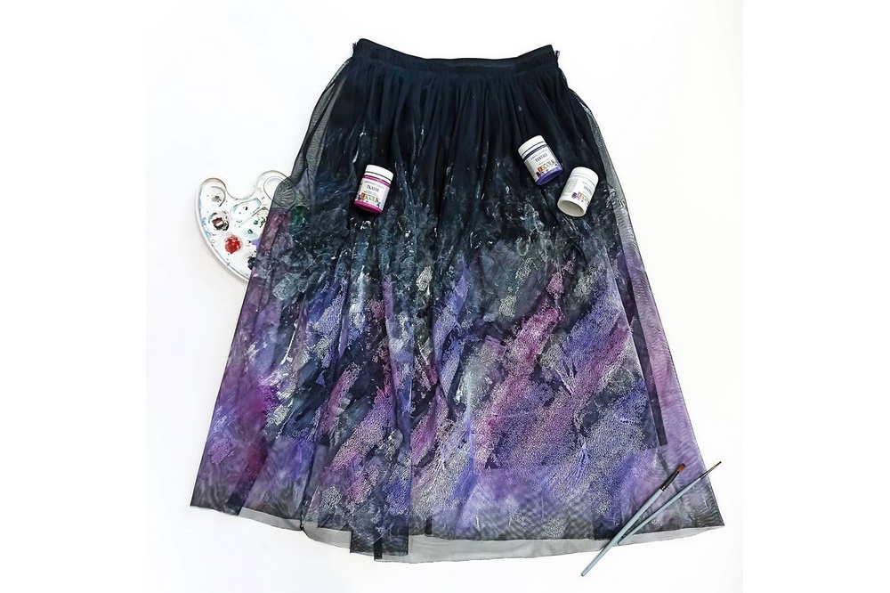 Однажды расписывала себе юбку из сетки — было достаточно необычно, потому что, если меня спросят, как я разрисовала сетку, я не смогу объяснить. Там просто такие техники, которые я придумывала сама, что объяснить это адекватно невозможно.