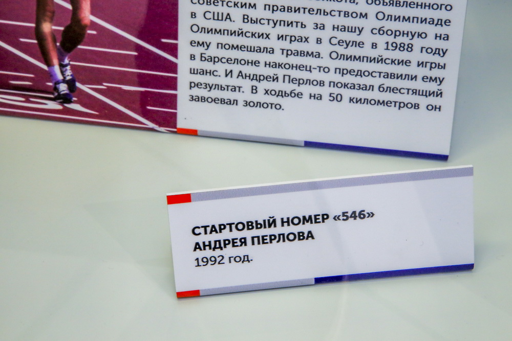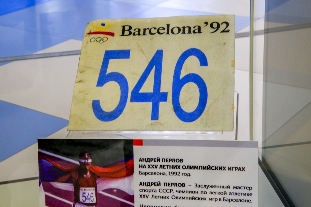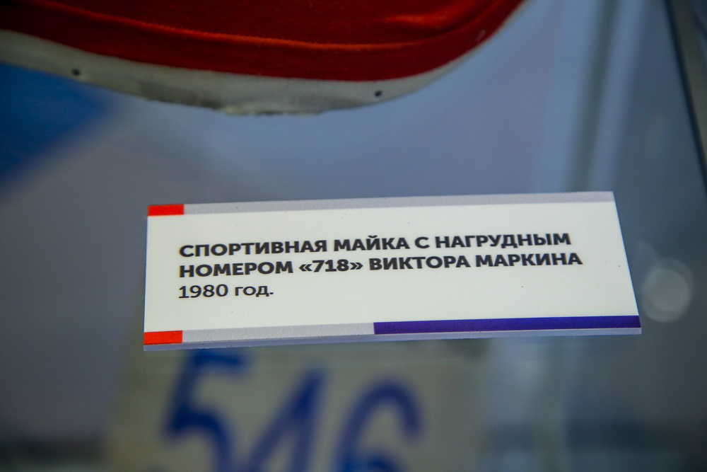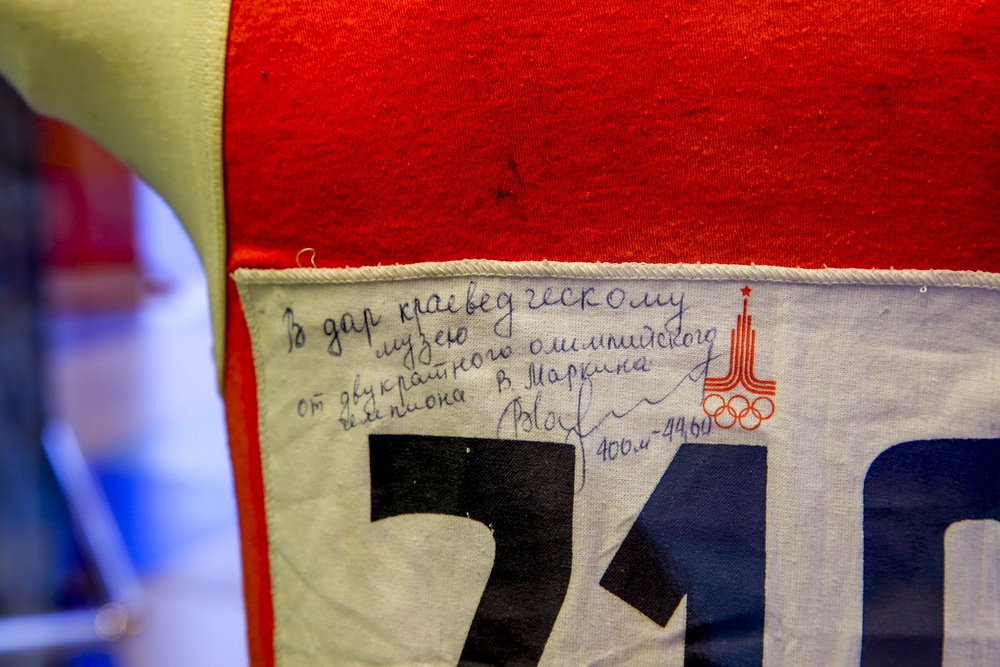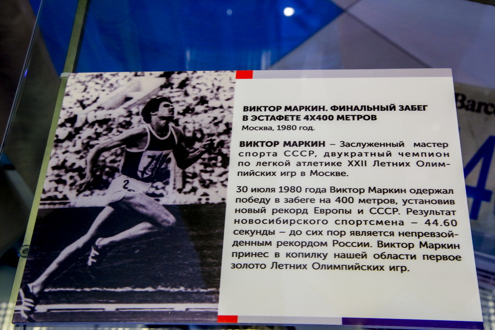 В числе экспонатов — личные вещи и предметы экипировки спортсменов. Например, майка с нагрудным номером «718» легкоатлета из Новосибирска Виктора Маркина, в которой он выступал на летних Олимпийских играх в Москве в 1980 году. Спортсмен лично передал майку краеведческому музею. На ней Виктор Маркин записал данные своего рекорда. Тогда на Олимпиаде он одержал победу в забеге на 400 метров, установив новый рекорд для Европы и СССР. Результат новосибирского спортсмена — 44,60 секунды — до сих пор остаётся непревзойдённым в России.