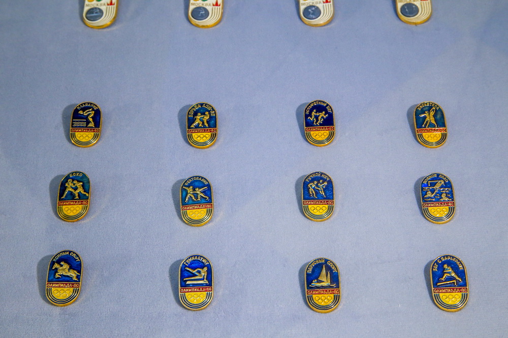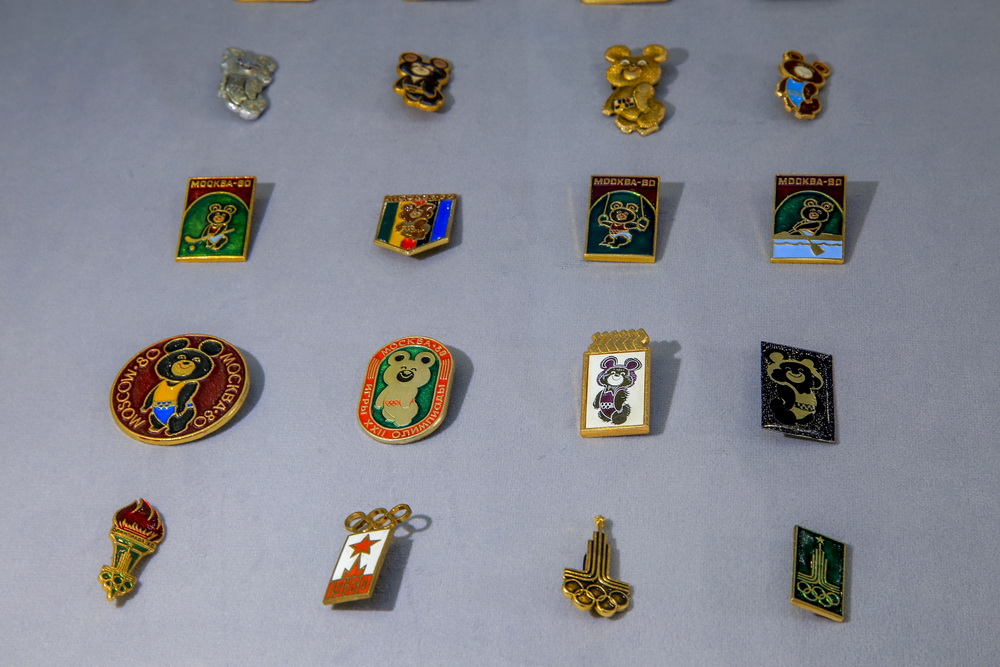 Экспозицию дополняет редкая коллекция значков, в том числе со знаменитым олимпийским мишкой. Обладать таким аксессуаром когда-то мечтал каждый советский человек.