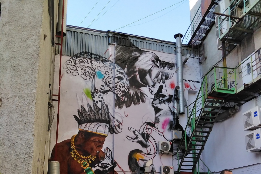 Несколько дней назад в одном из секретных двориков Красного проспекта мексиканский художник Трепо Паркер начал расписывать огромную глухую стену. Несмотря на то, что до завершения мурала ещё далеко, уже сейчас понятно, что изображённый сюжет взят из мексиканской жизни художника.