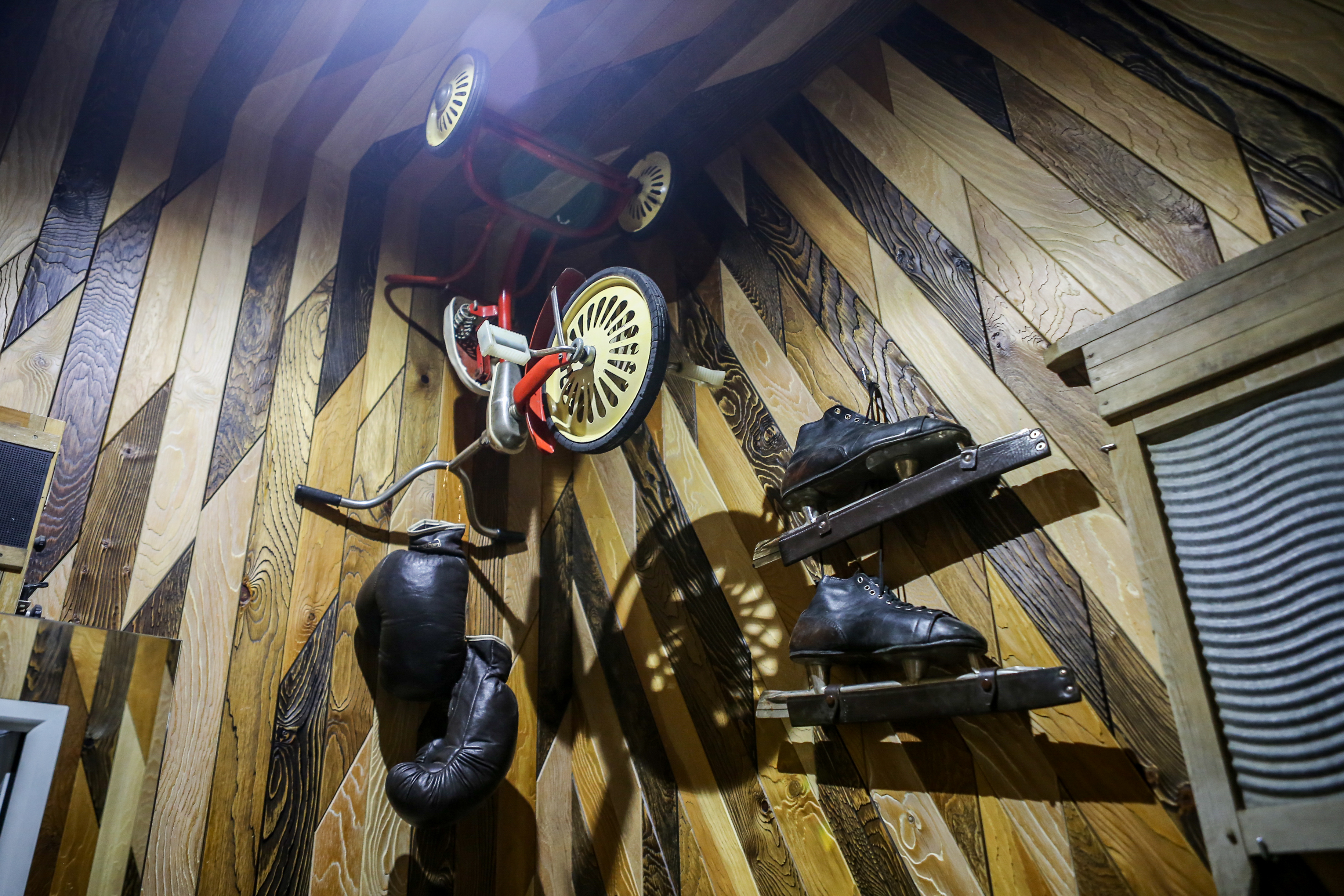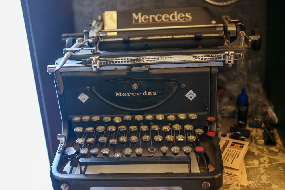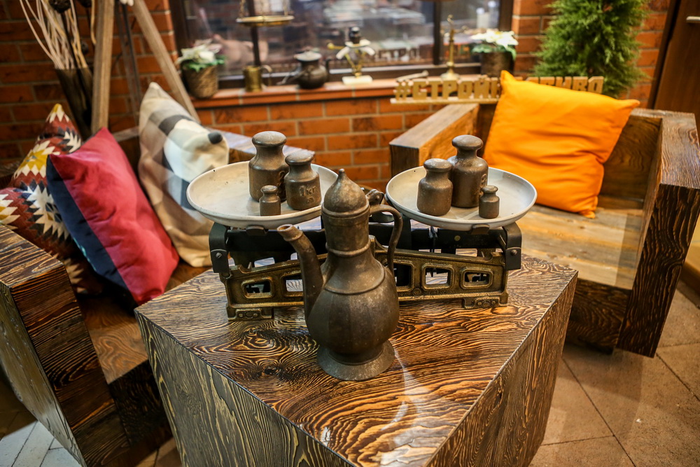 Однако уличная экспозиция — это далеко не всё, что хранит эта локация. В офисах торговой компании собрана целая коллекция старинных вещей. Причём это не отдельная экспозиция на стендах и витринах — предметы включены в интерьер. Они бросаются в глаза совершенно неожиданно. Тут и советские беговые коньки, и медный кувшин XVIII века, и сундук-казна, и антикварная пишущая машинка «Мерседес».