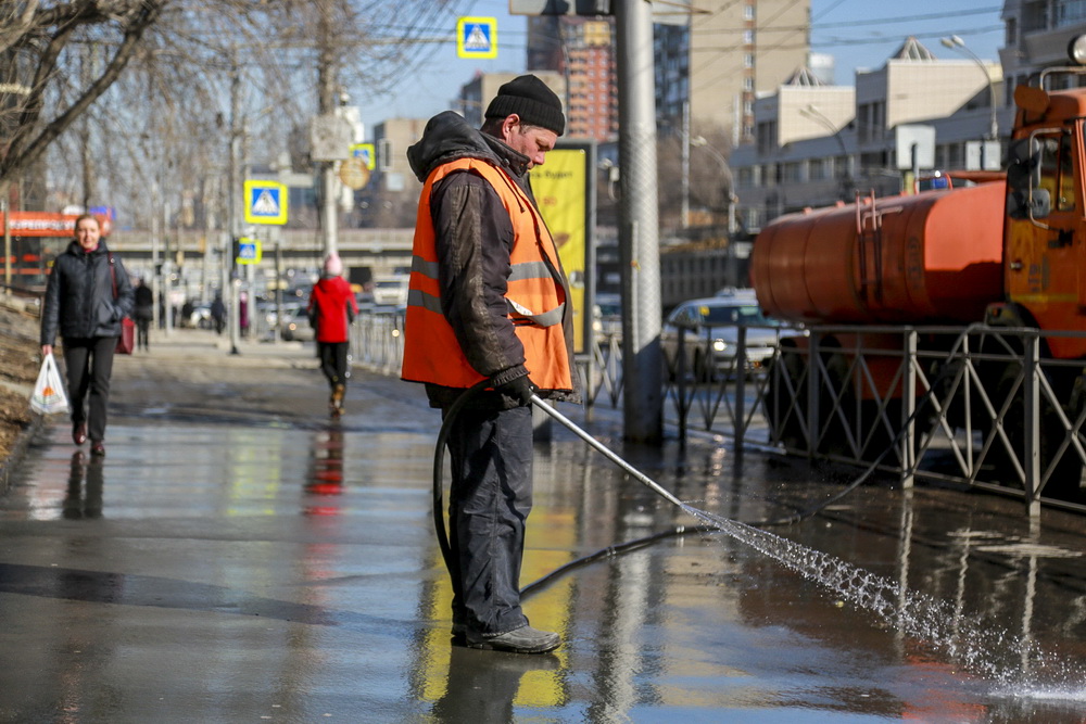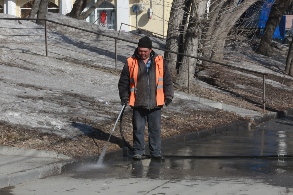 «На данный момент моем тротуар. После зимы смываем грязь, какая накопилась. Мы же не один его раз моем. По весне, пока всё не будет чисто, пока не вымоется весь тротуар, так и будем убирать. Вон там ребята впереди убирают метёлками, лопатами. Сзади идём, смываем, всё чтобы чисто было», — рассказал сотрудник дорожно-эксплуатационного управления №1 Фёдор Терентий.