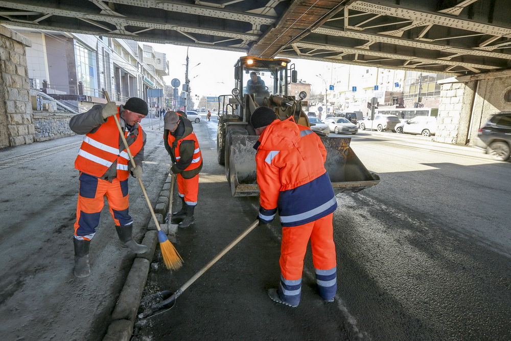 Днём, при плюсовой температуре, дорожники очищают покрытие водой и собирают грязь лопатами. После уборки приступят к заключительному этапу: будут промывать дороги с использованием специального шампуня.