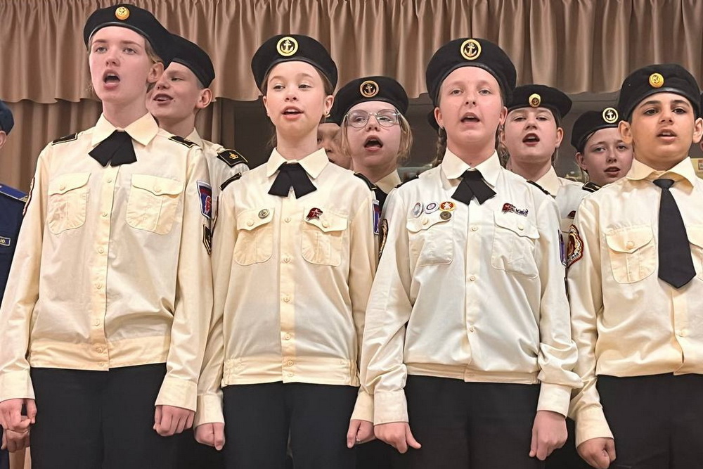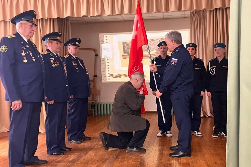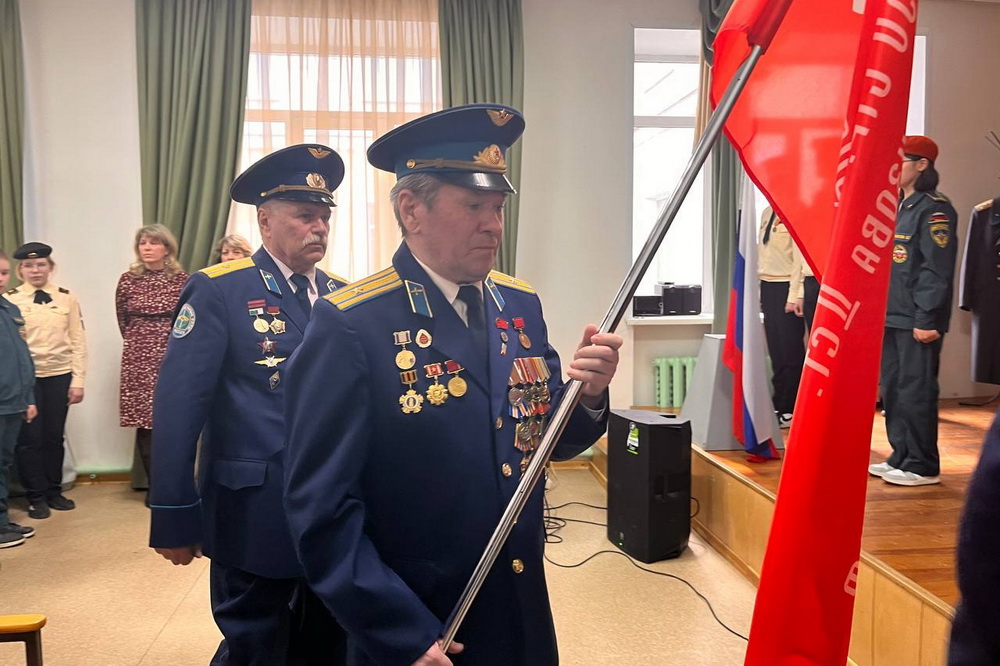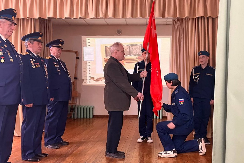 В торжественной обстановке алый флаг из рук ветеранов вооружённых сил приняли старшеклассники и кадеты класса «Юные лётчики».