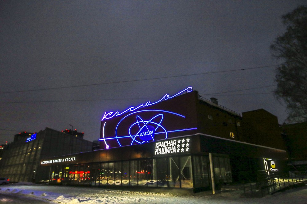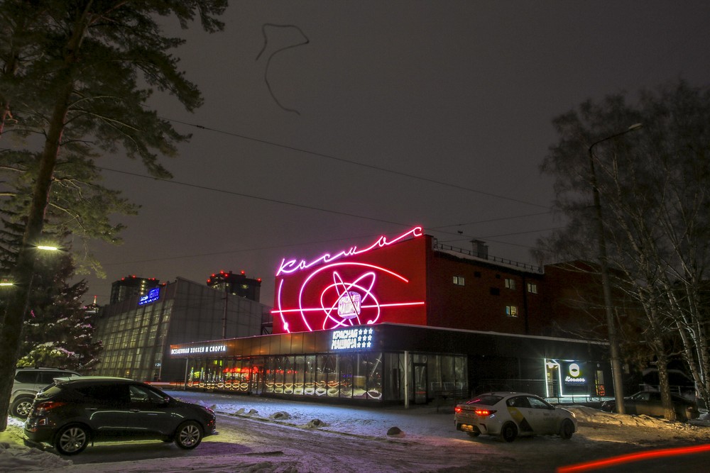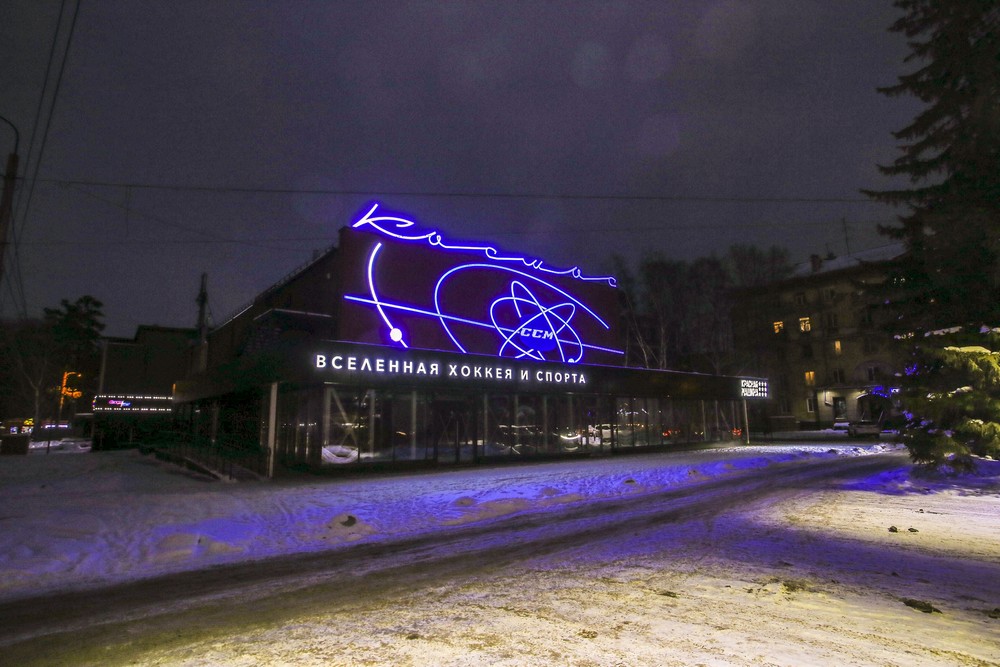 Центр хоккейного мастерства «Космос» в Калининском районе Новосибирске по вечерам теперь светится, как рождественская ёлка, озаряя весь квартал. После реконструкции зданию не только вернули историческую вывеску, но и подсветили её яркой иллюминацией.